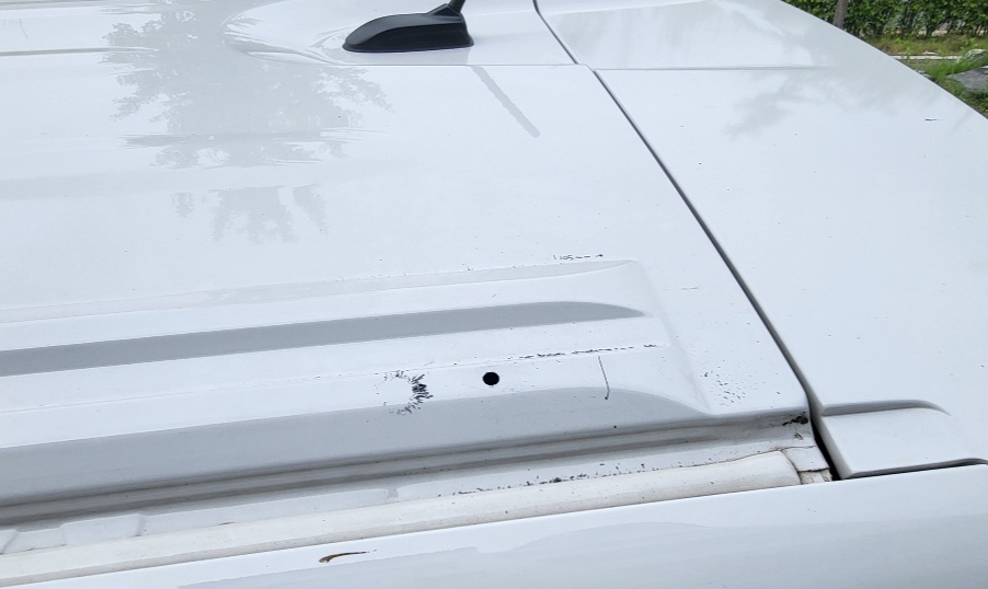 저 구멍자리에 볼트 넣어보면 , 볼트가 길어서 아래 철판에 살짝 닿고 지붕 위에 고정되는 플라스틱 브라켓에 잭너트 머리가 고정되지 못하여 볼트 돌리면 헛돈다. 내부에서 잭너트 헛돌지 않게 잡은 상태에서 외부에서 볼트 돌려야 함.