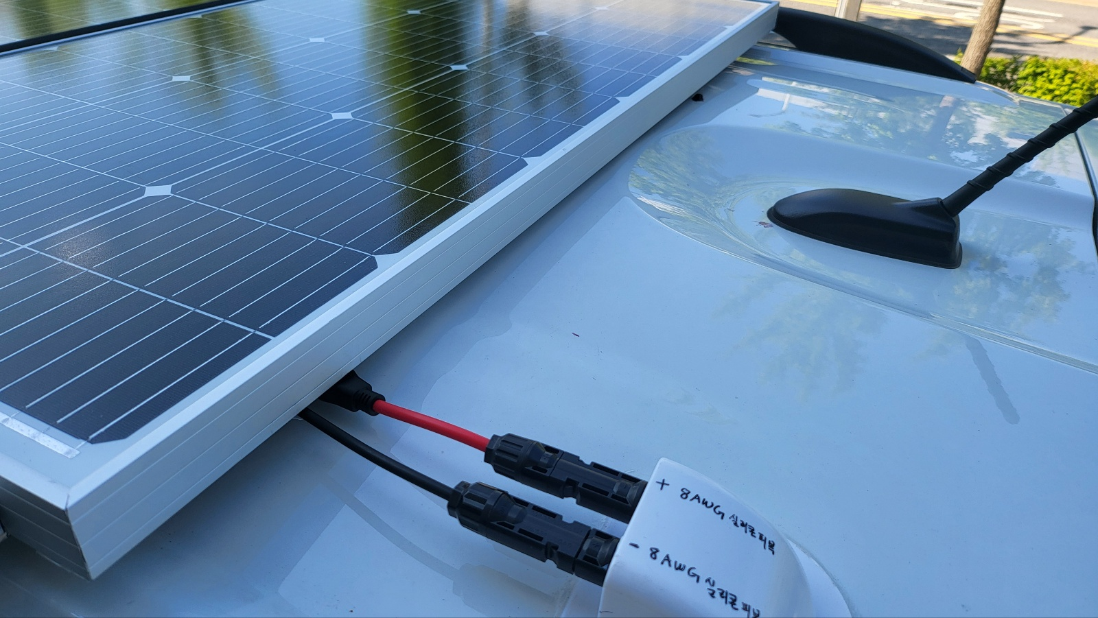 케이블들은 패널의 뒷면(백색) 에 실리콘 단면 테이프로 부착하여 차량 지붕에 닿지 않게 함.