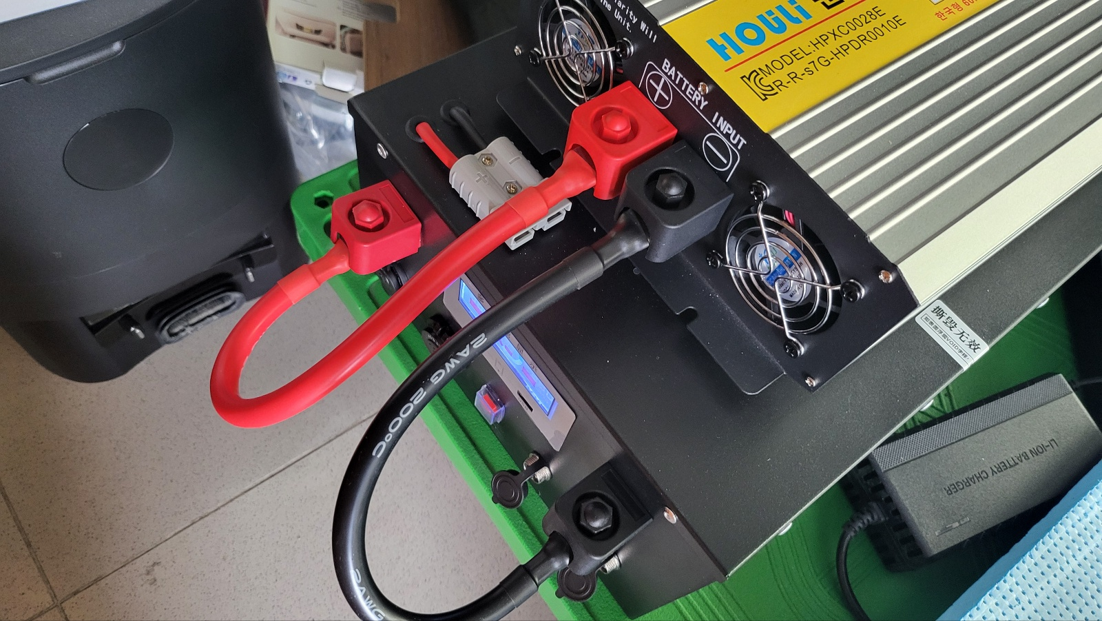 - 연결 순서 규칙 : 인버터 파워 오프 상태에서 인버터쪽부터 전선 먼저 연결하고, 배터리 쪽은 (-) 측 먼저 연결 마지막에 배터리 (+) 연결.