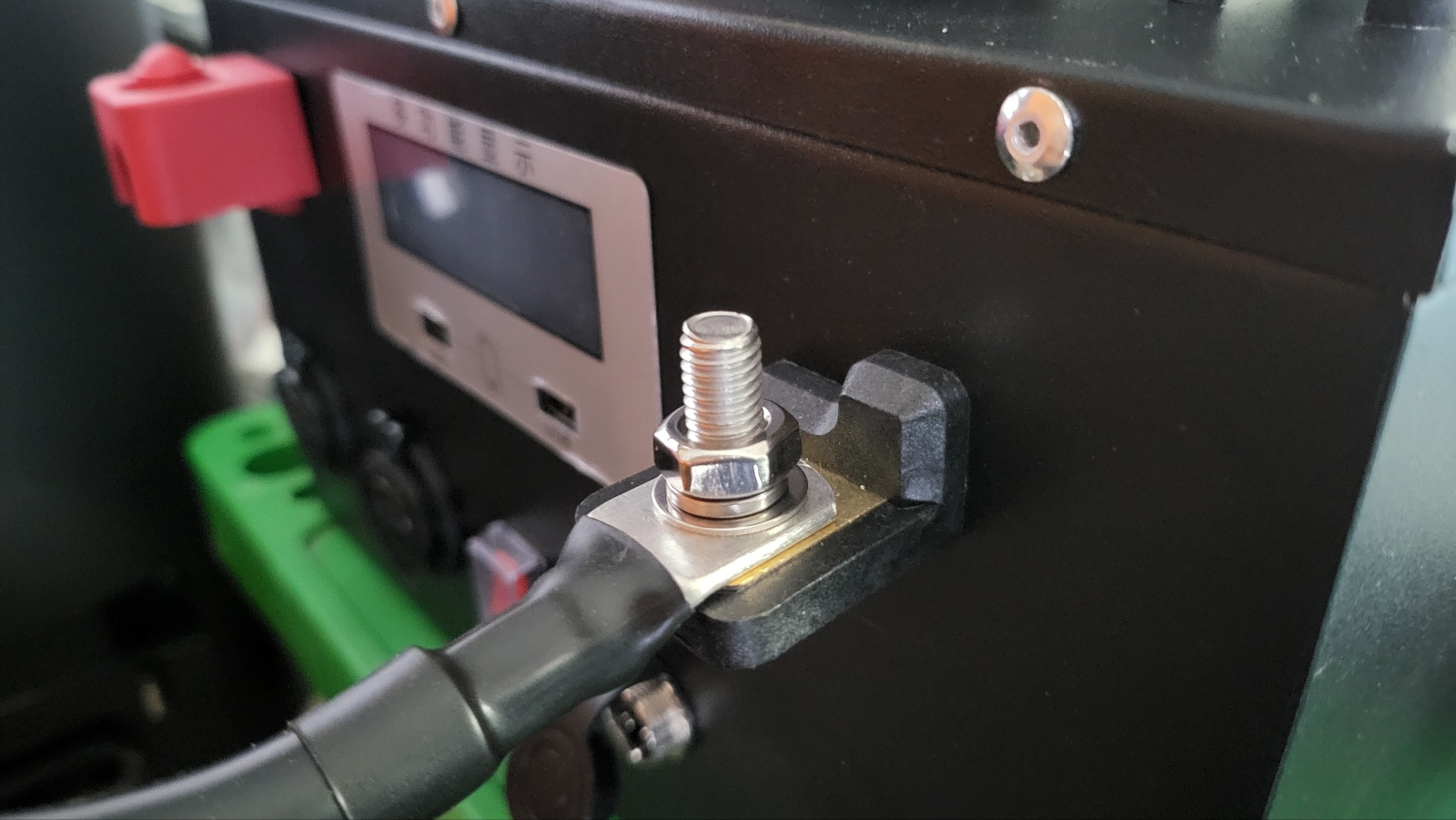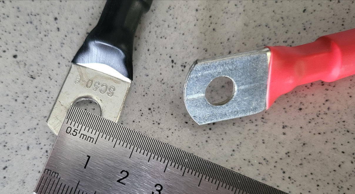 인산철 배터리 연결 단자쪽도 동일하게 구리면에 많은 면적이 닿도록 하고 그 위에 와셔 , 너트 풀림 방지 와셔 , 마지막에 너트 체결.