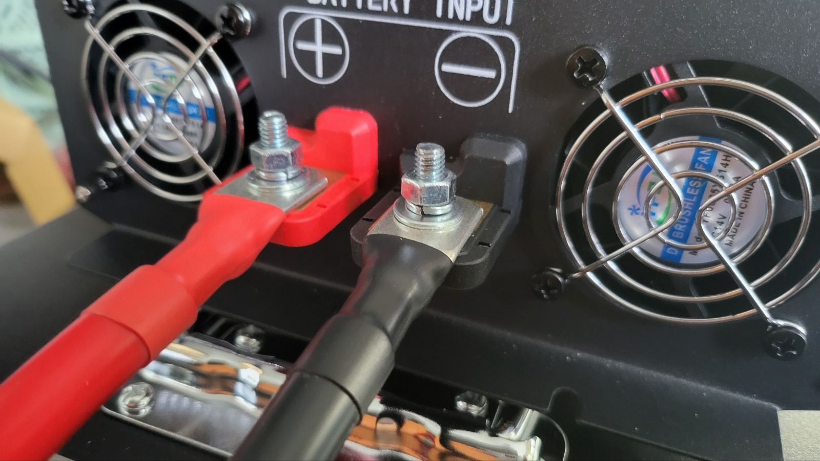 - 인버터 연속 출력 용량을 3kW 로 사용하게 되면 배터리에서 인버터쪽으로 흐르는 전류는 234A (= 3000 W / 12.8V) 이므로 전선도 이 전류를 견딜 수 있는 것을 적용 해야하며 배터리와 인버터 연결하는 전선 길이는 짧을 수록 발열이 덜 하므로 배터리 출력부와 인버터 입력부는 최대한 가깝게 배치 한다.