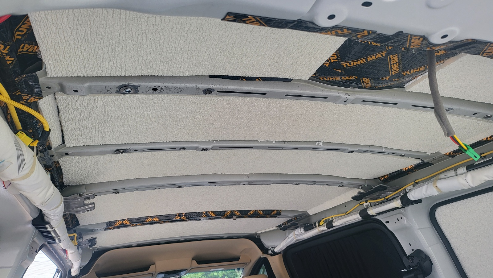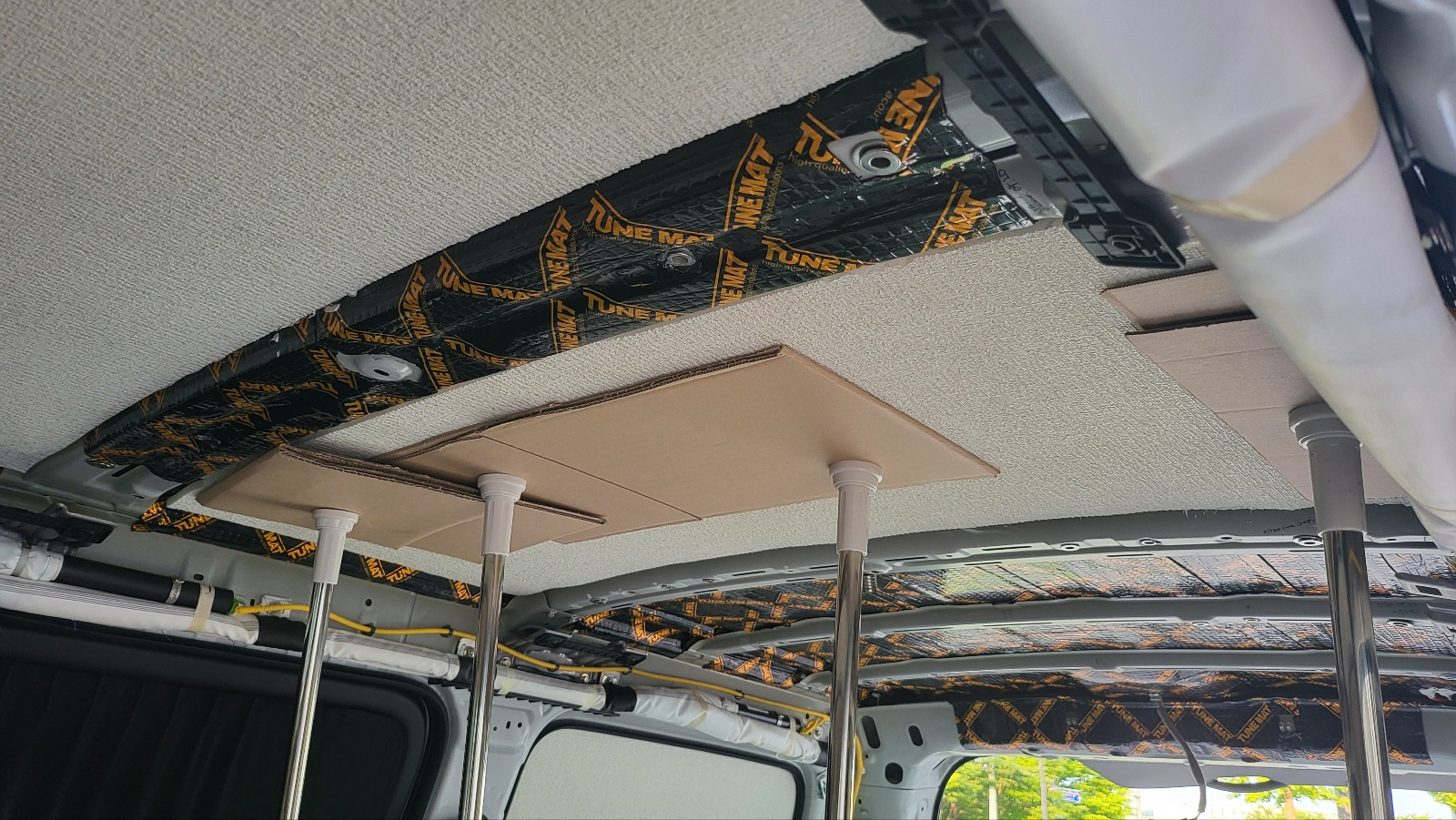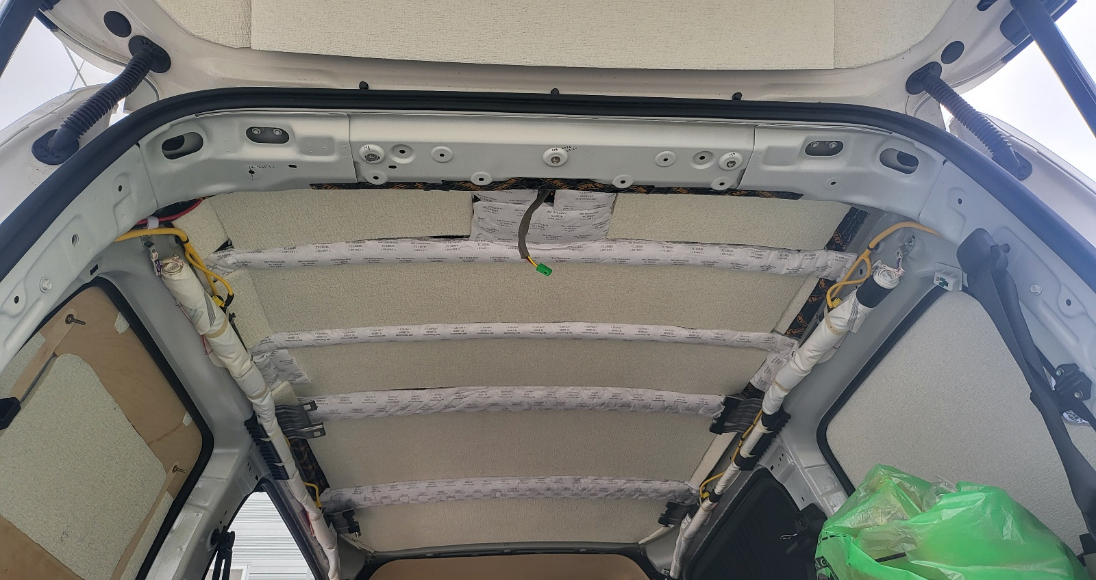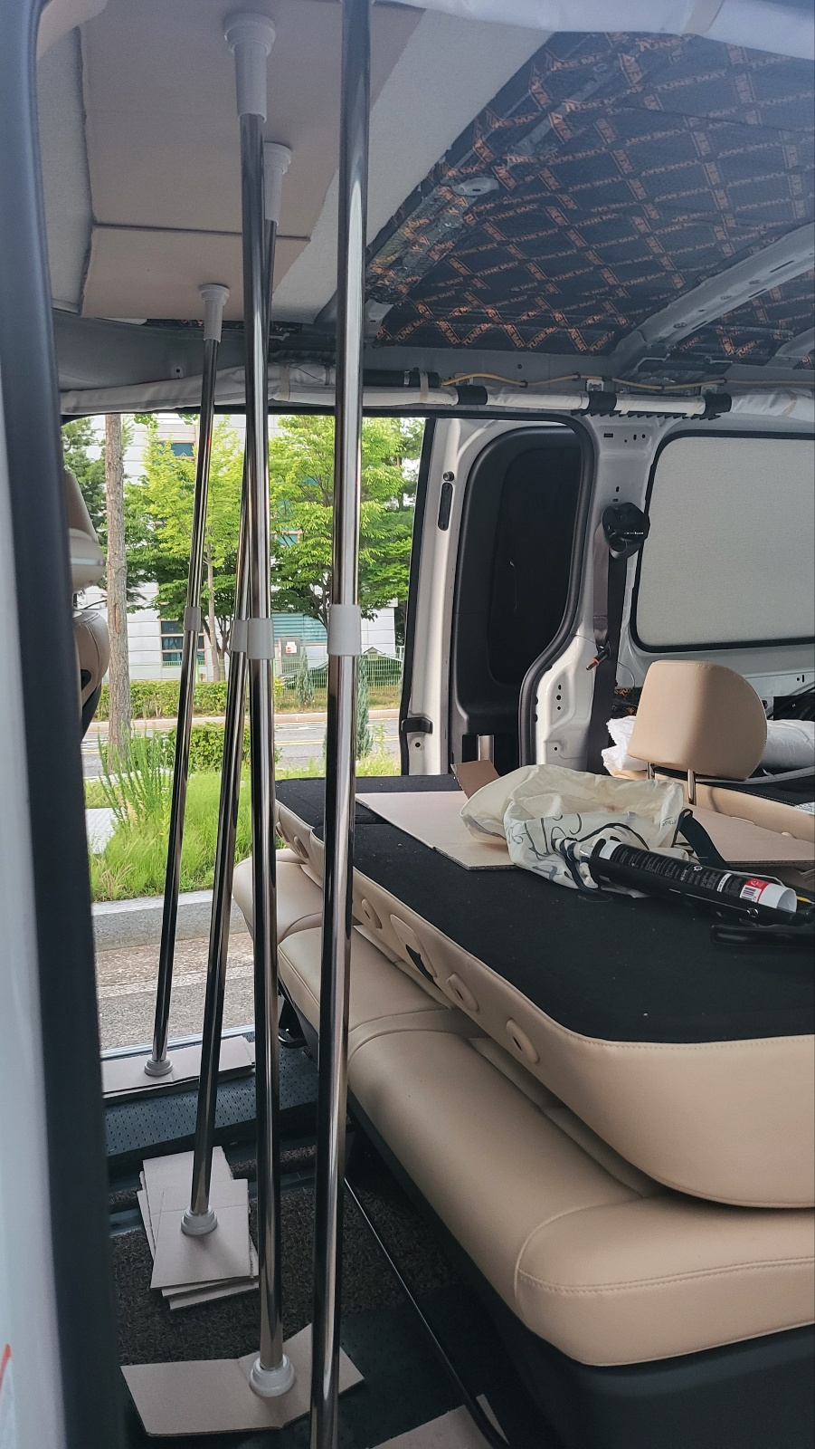 - 차량 천장에 두께 10mm 단열재 부착했기에, 차량 철판에 밀착되는 압축 폼 10mm 정도 잘라 높이 줄인다.