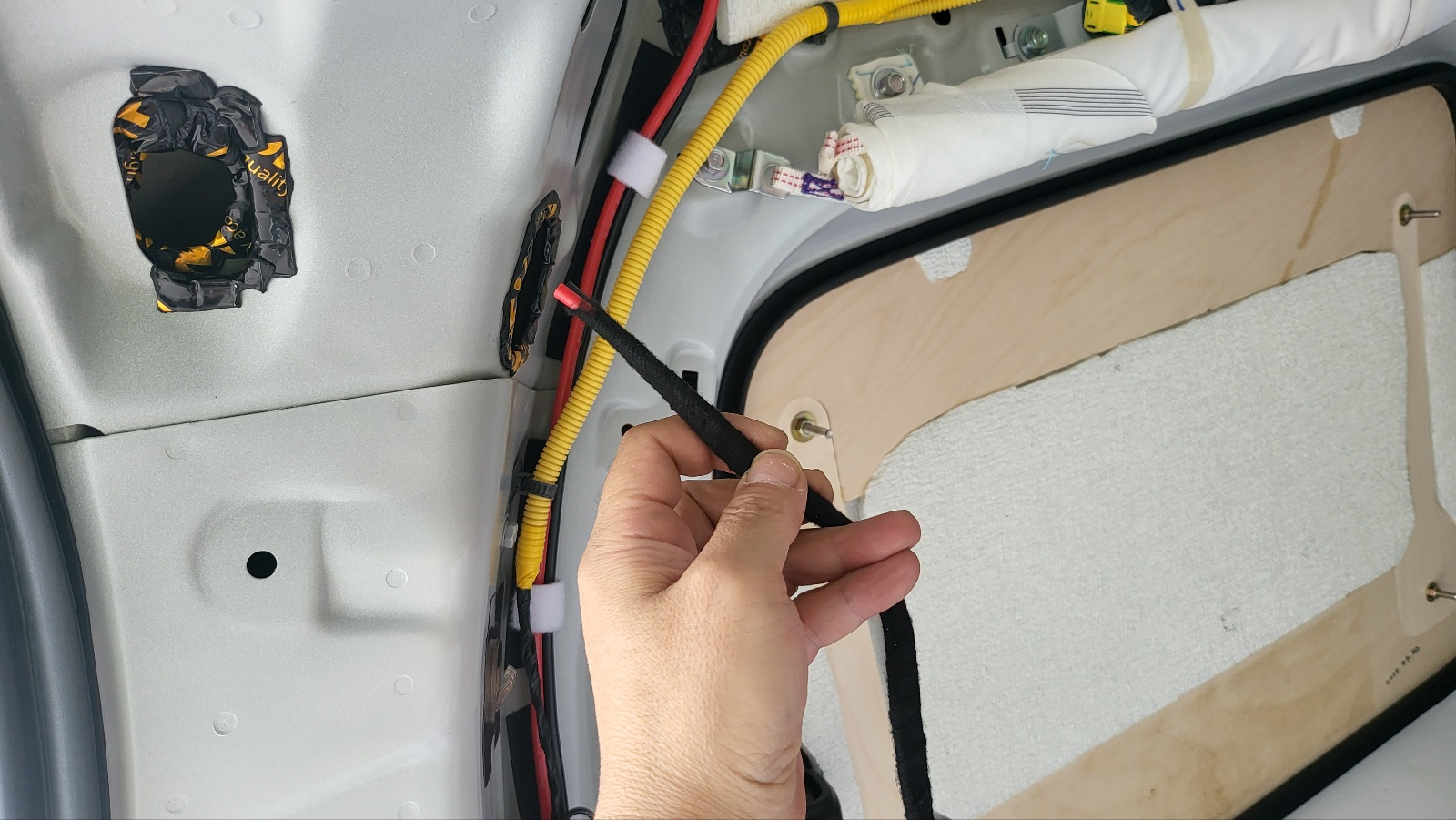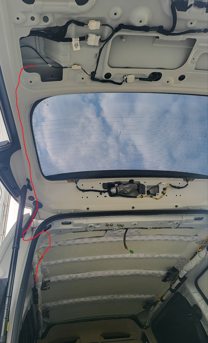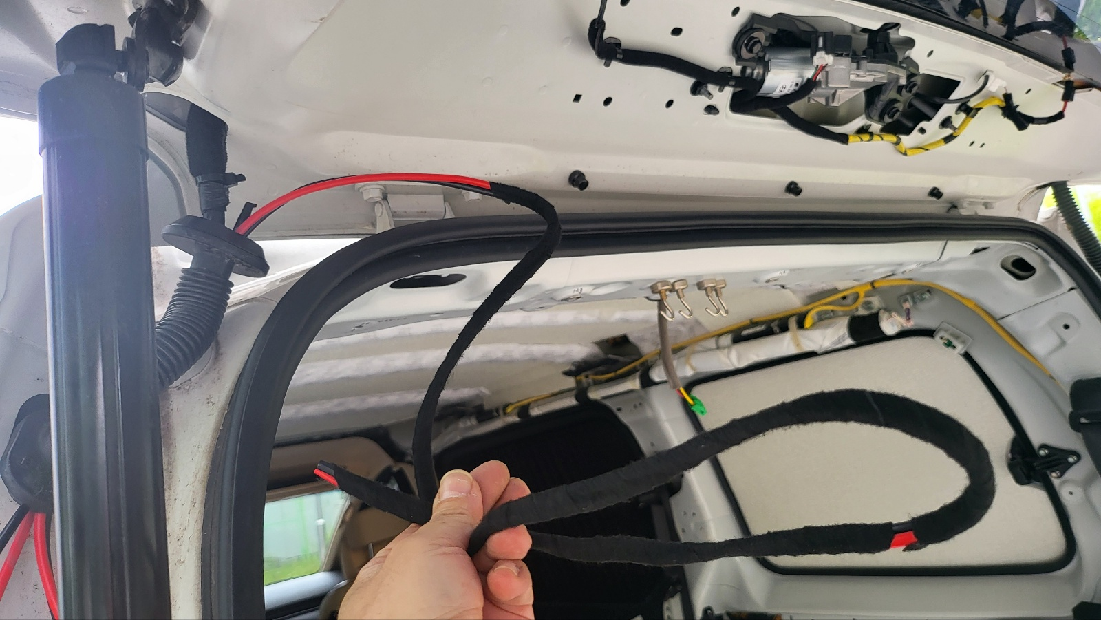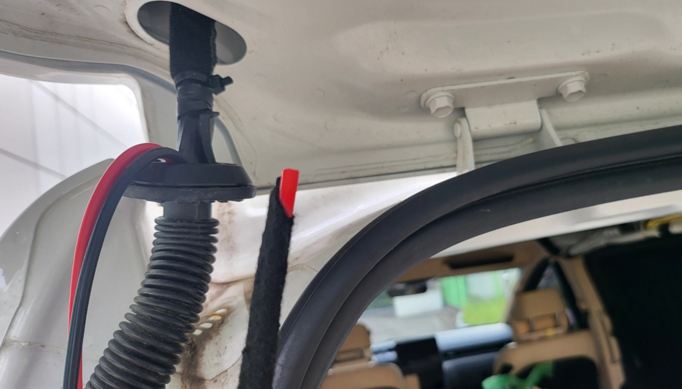 테일 게이트 45도 정도만 열리게 한 상태에서 , 위 사진의 테일게이트 구멍에 밀어 넣어주면 아래 사진처럼 전선이 테일게이트 중간 부분까지 내려온다.
