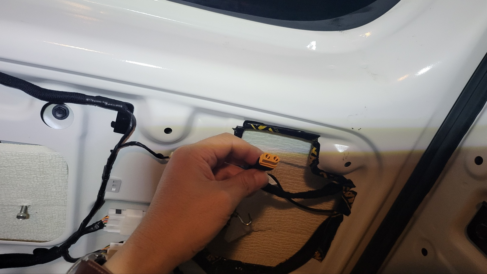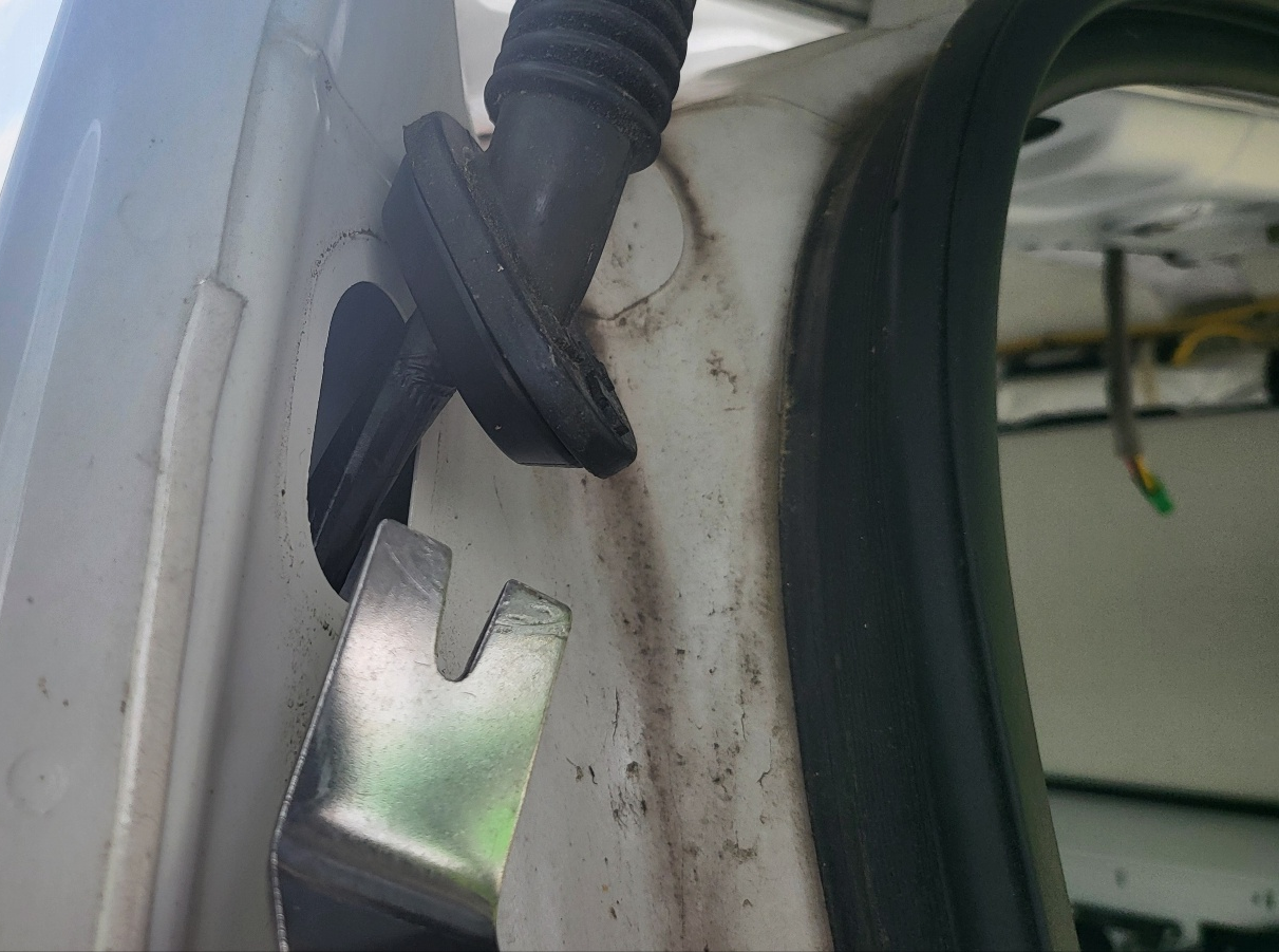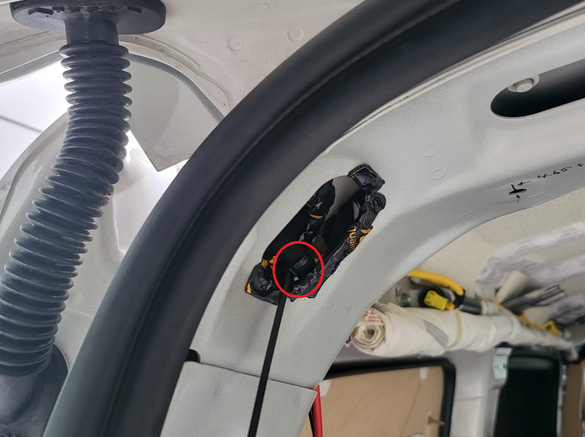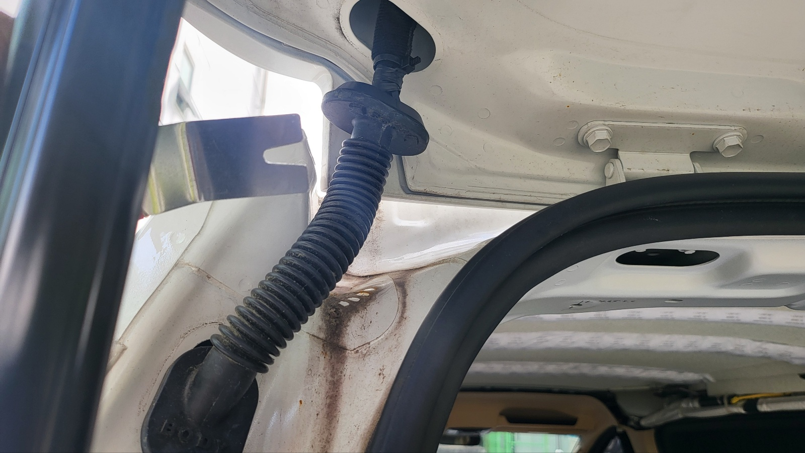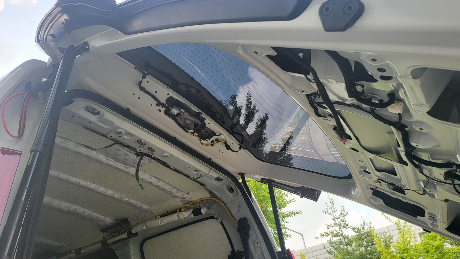 테일 게이트 45도 정도만 열리게 한 상태에서 , 위 사진의 테일게이트 구멍에 밀어 넣어주면 아래 사진처럼 전선이 테일게이트 중간 부분까지 내려온다.