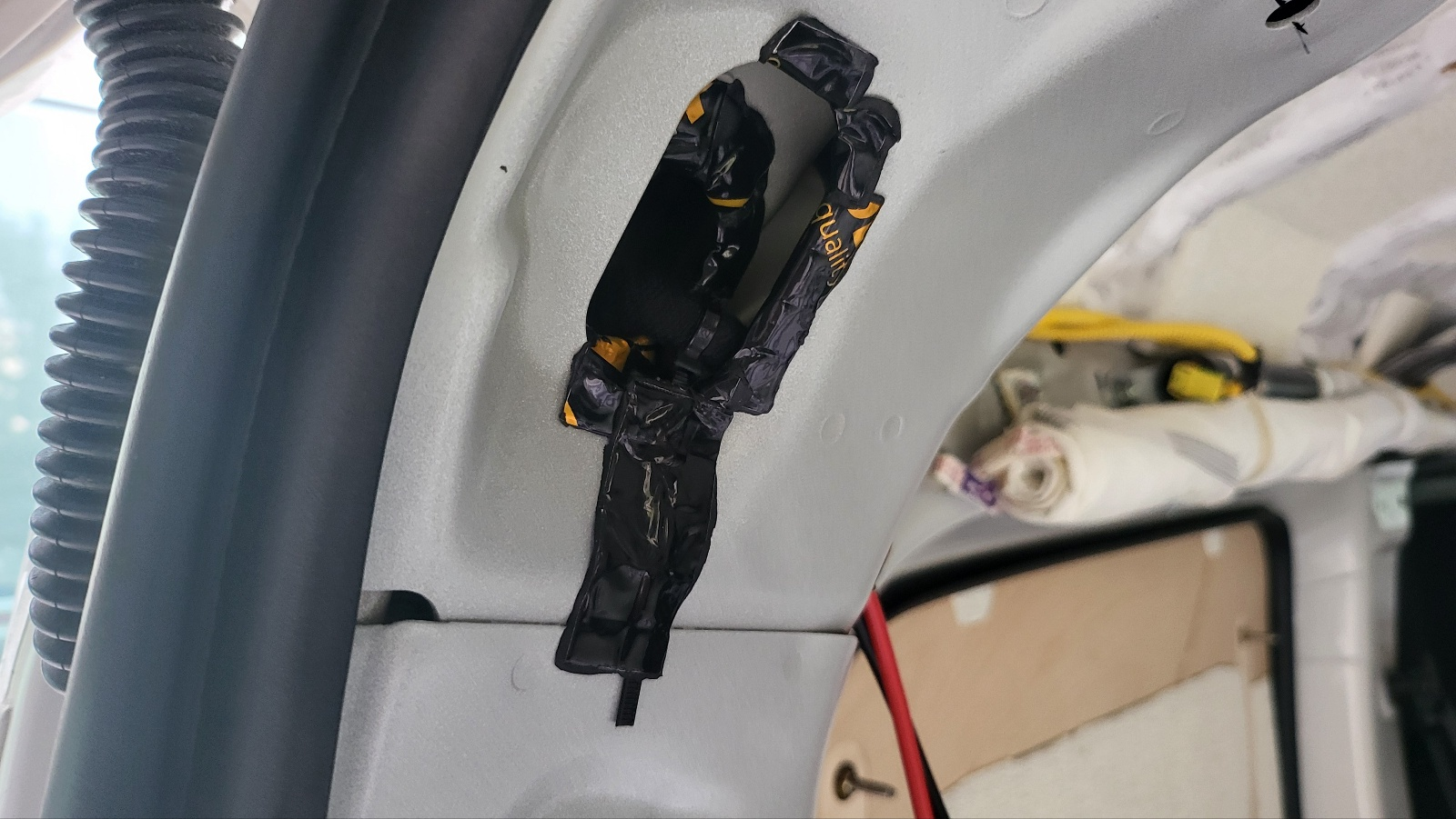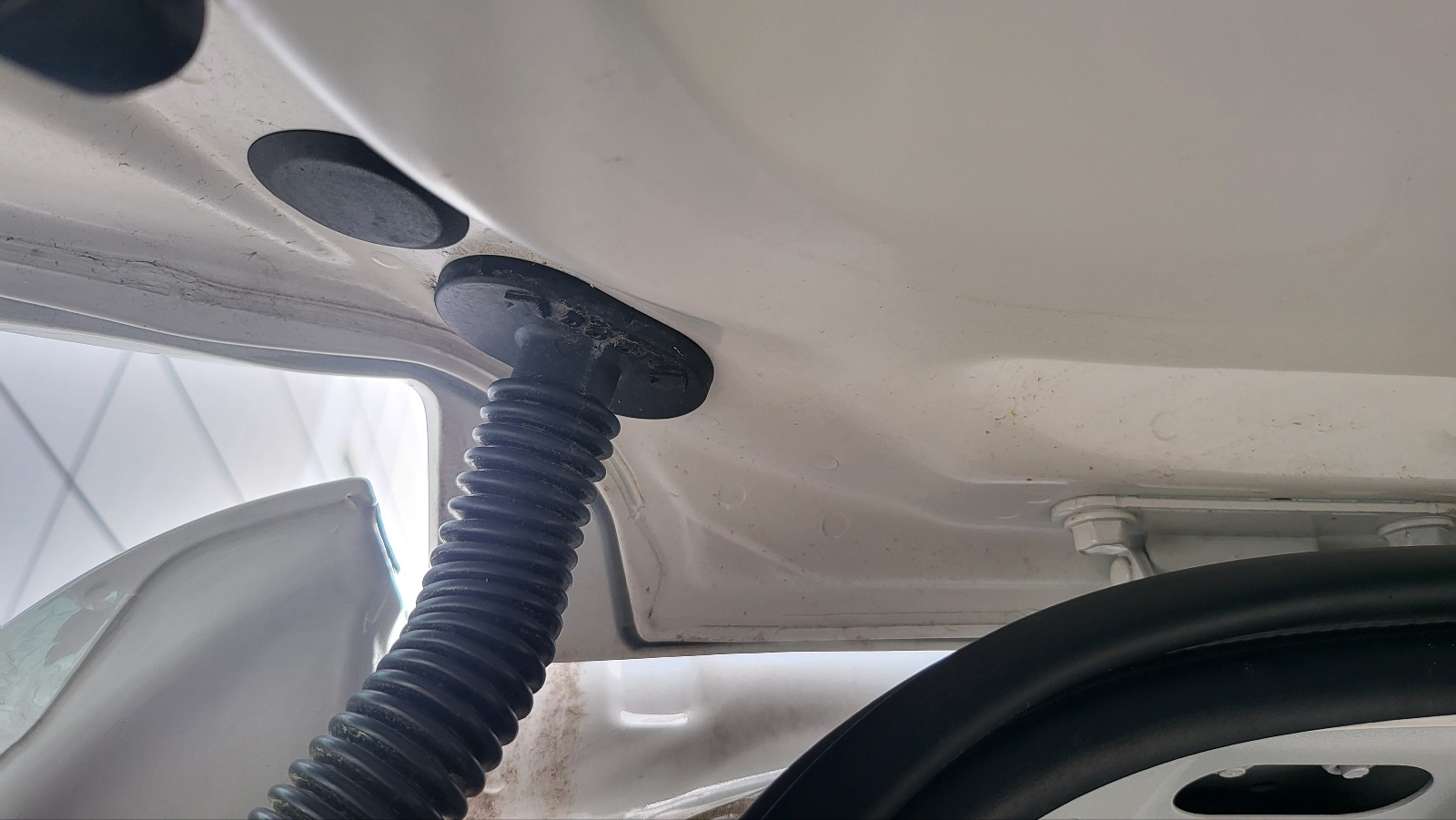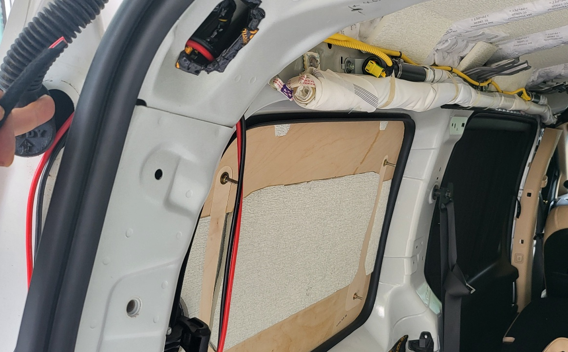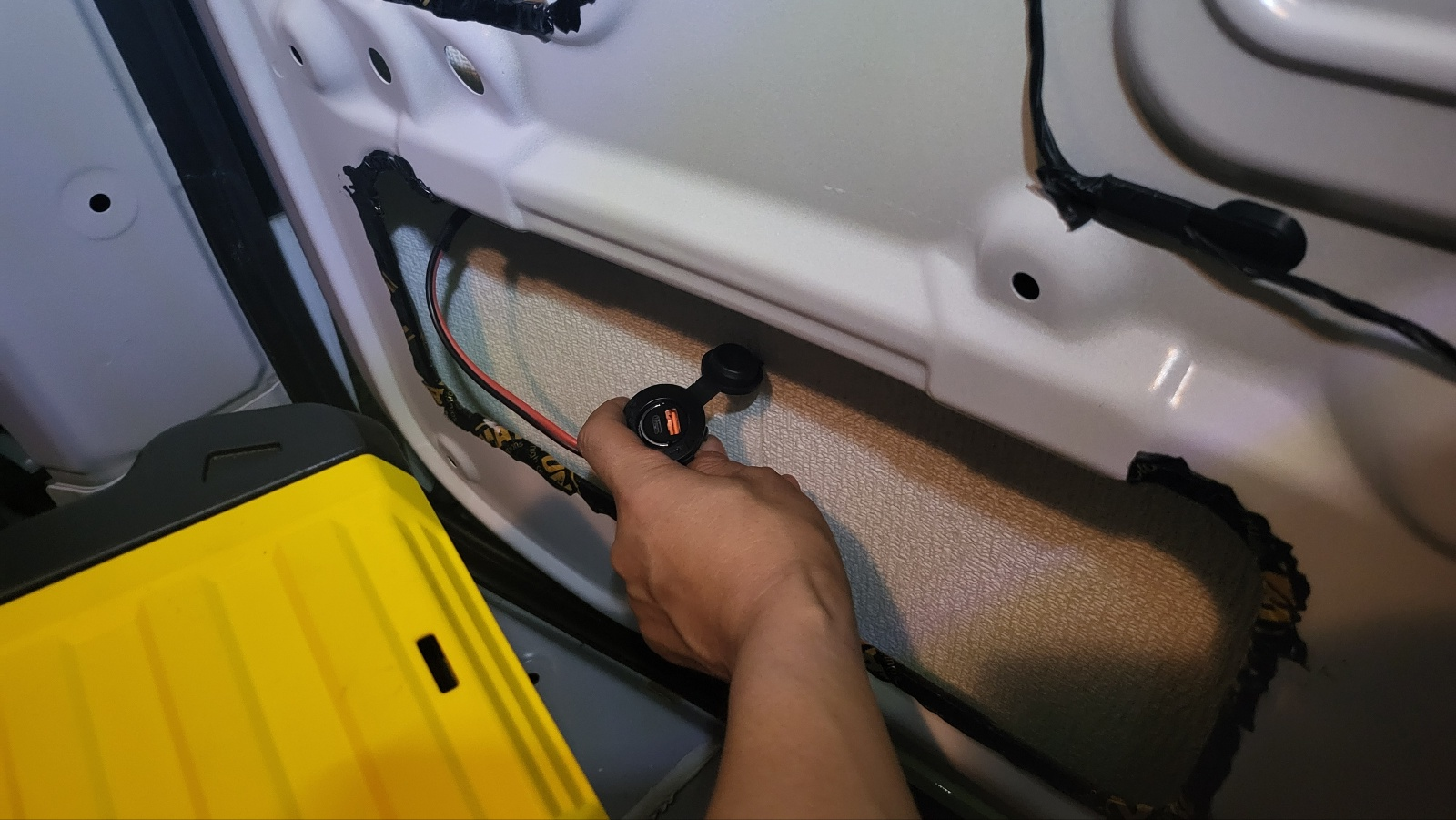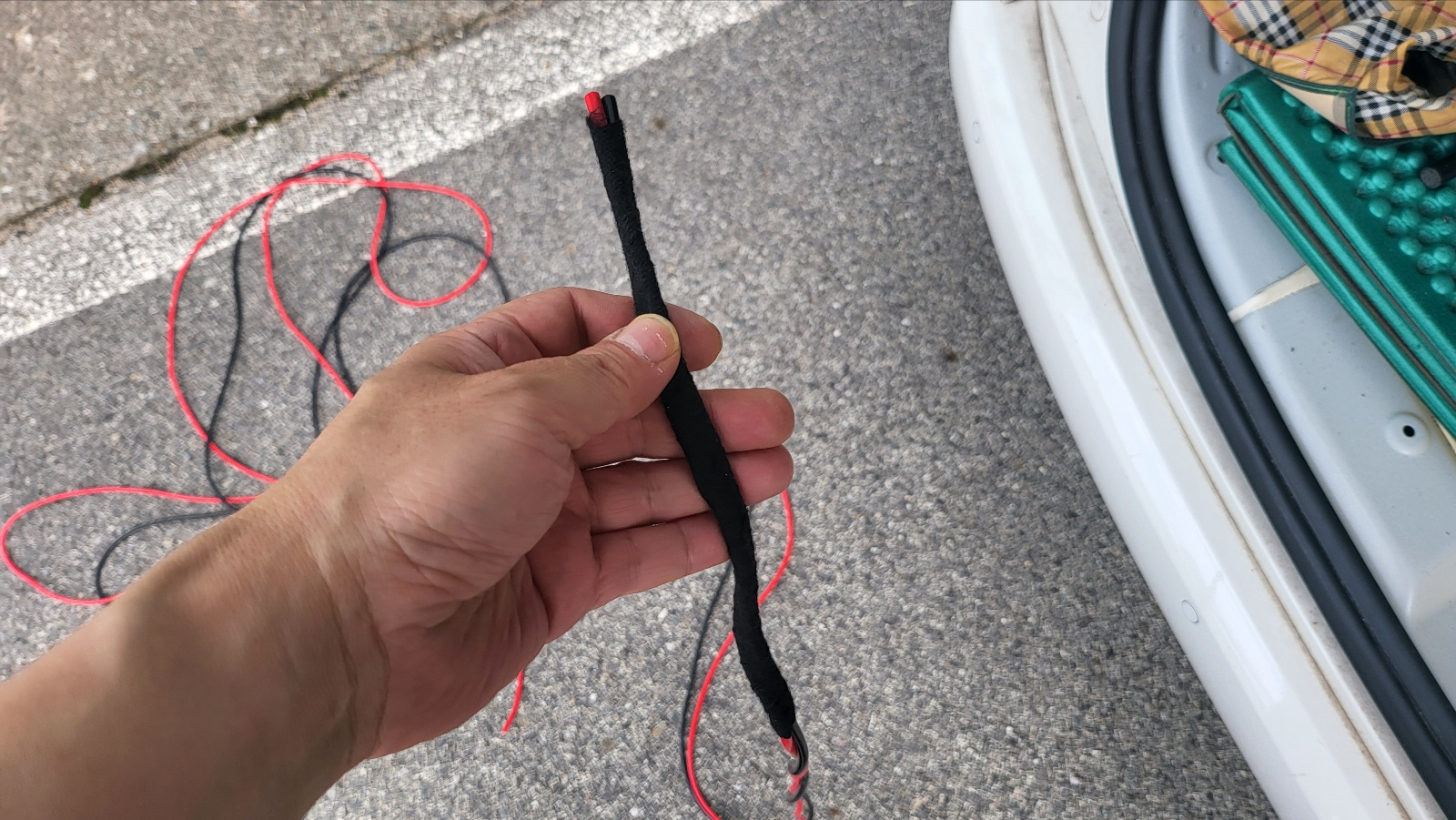 테일 게이트 45도 정도만 열리게 한 상태에서 , 위 사진의 테일게이트 구멍에 밀어 넣어주면 아래 사진처럼 전선이 테일게이트 중간 부분까지 내려온다.
