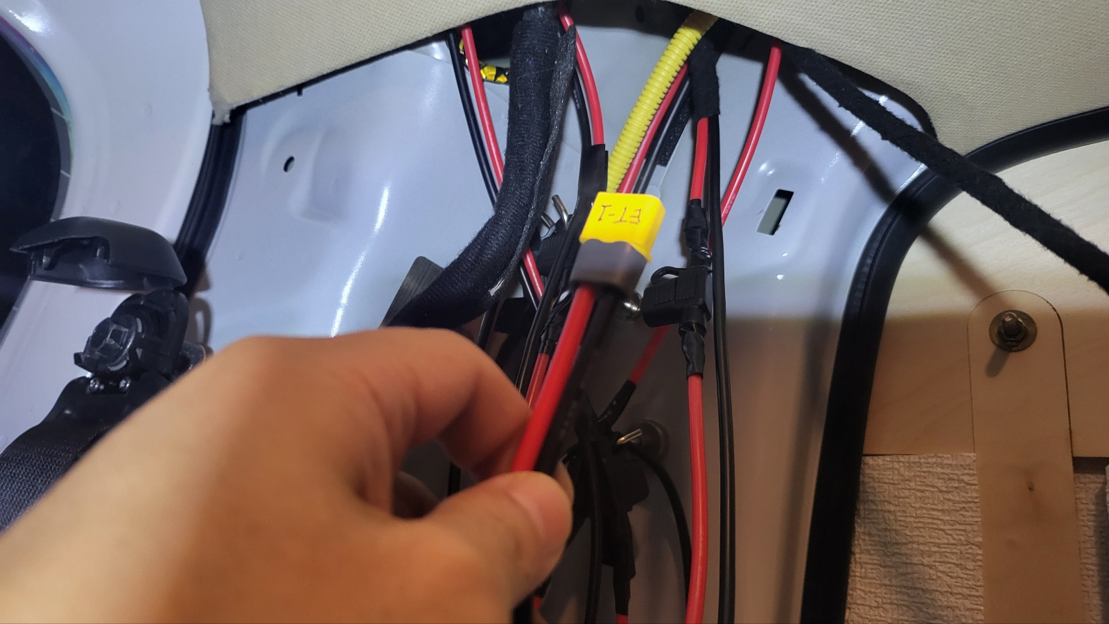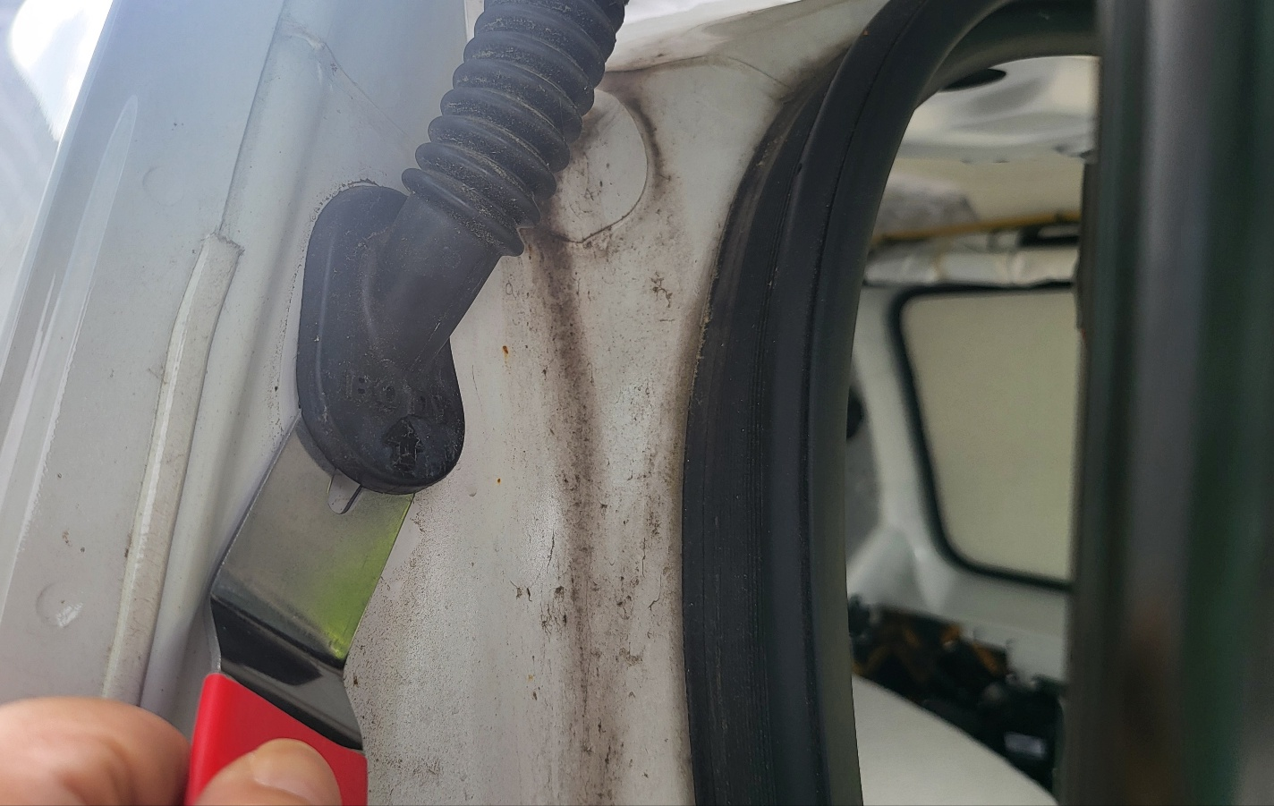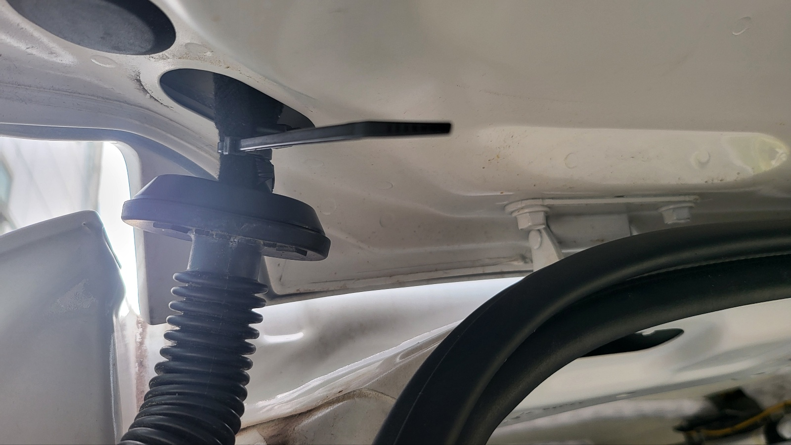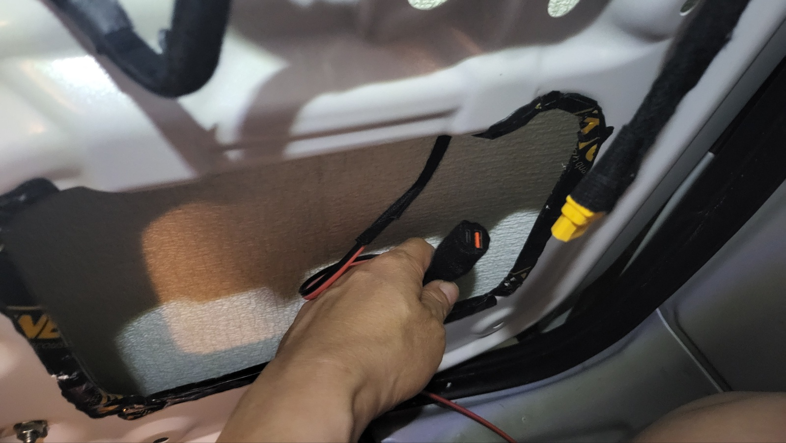 테일 게이트 45도 정도만 열리게 한 상태에서 , 위 사진의 테일게이트 구멍에 밀어 넣어주면 아래 사진처럼 전선이 테일게이트 중간 부분까지 내려온다.