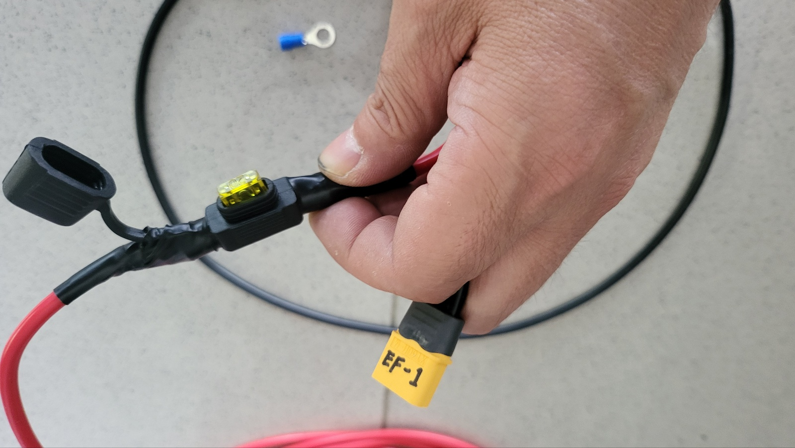 XT60 커넥터에 본 전선이 활용되는 영역(EF-1) 마킹 해뒀고, + 전선에는 퓨즈 홀더 (퓨즈 용량 20A ) 연결해둠.