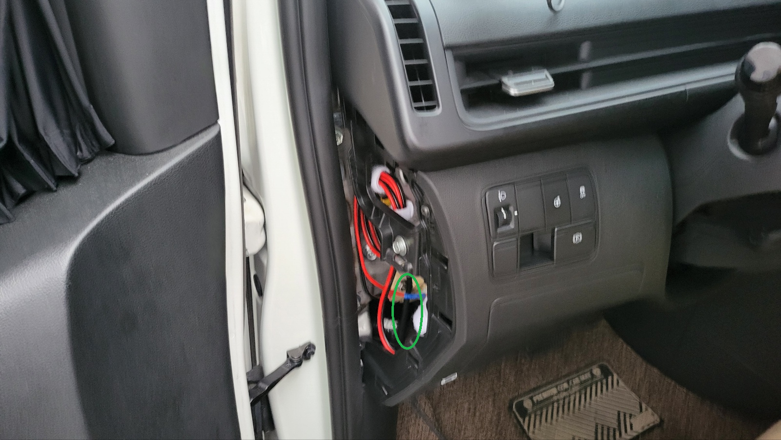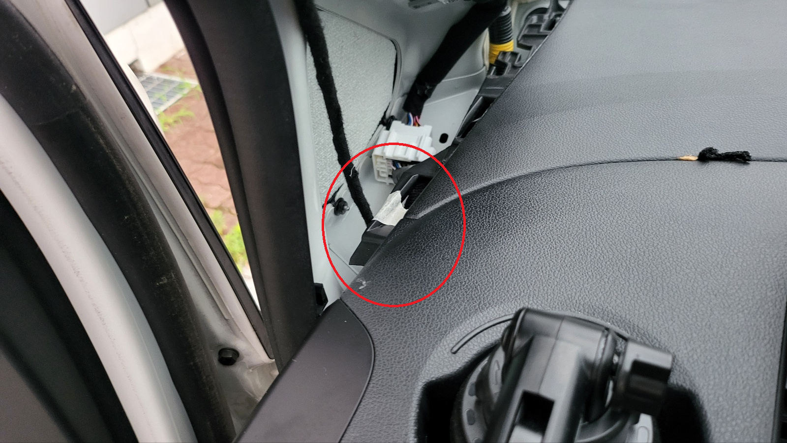 이제 대시 보드 왼쪽 측면에 전선 밀어 넣는다. 손으로 만져보면 큰 구멍이 있고 이 자리에 전선 집어 넣어 밀어 주면 자연스레 핸들 하단 왼쪽 퓨즈 박스 지점까지 전선이 내려간다.