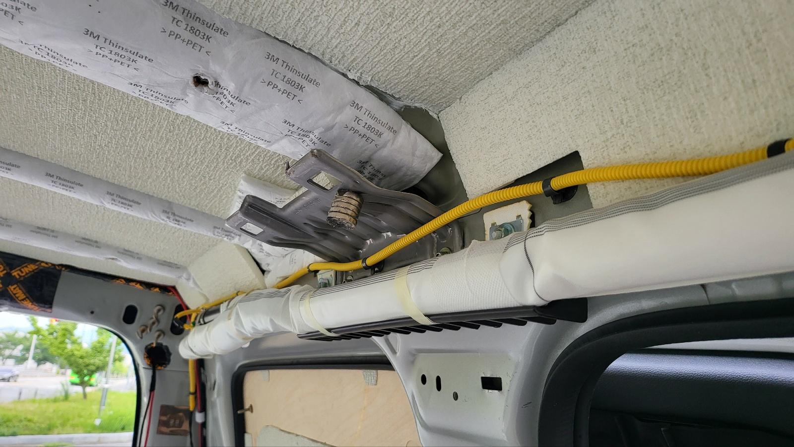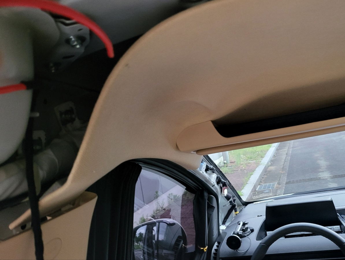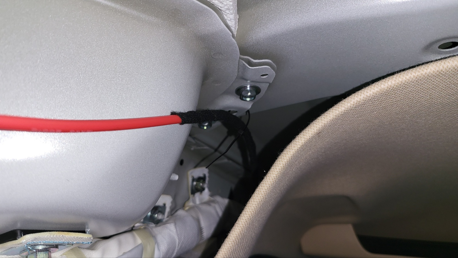 아래 사진. 운전석 상단 천장에서 차체에 빈틈이 있는 곳을 이용하여 전선을 타이로 고정. 타이로 고정하는 부위에는 필수 부직포 테이프 감아둔다.