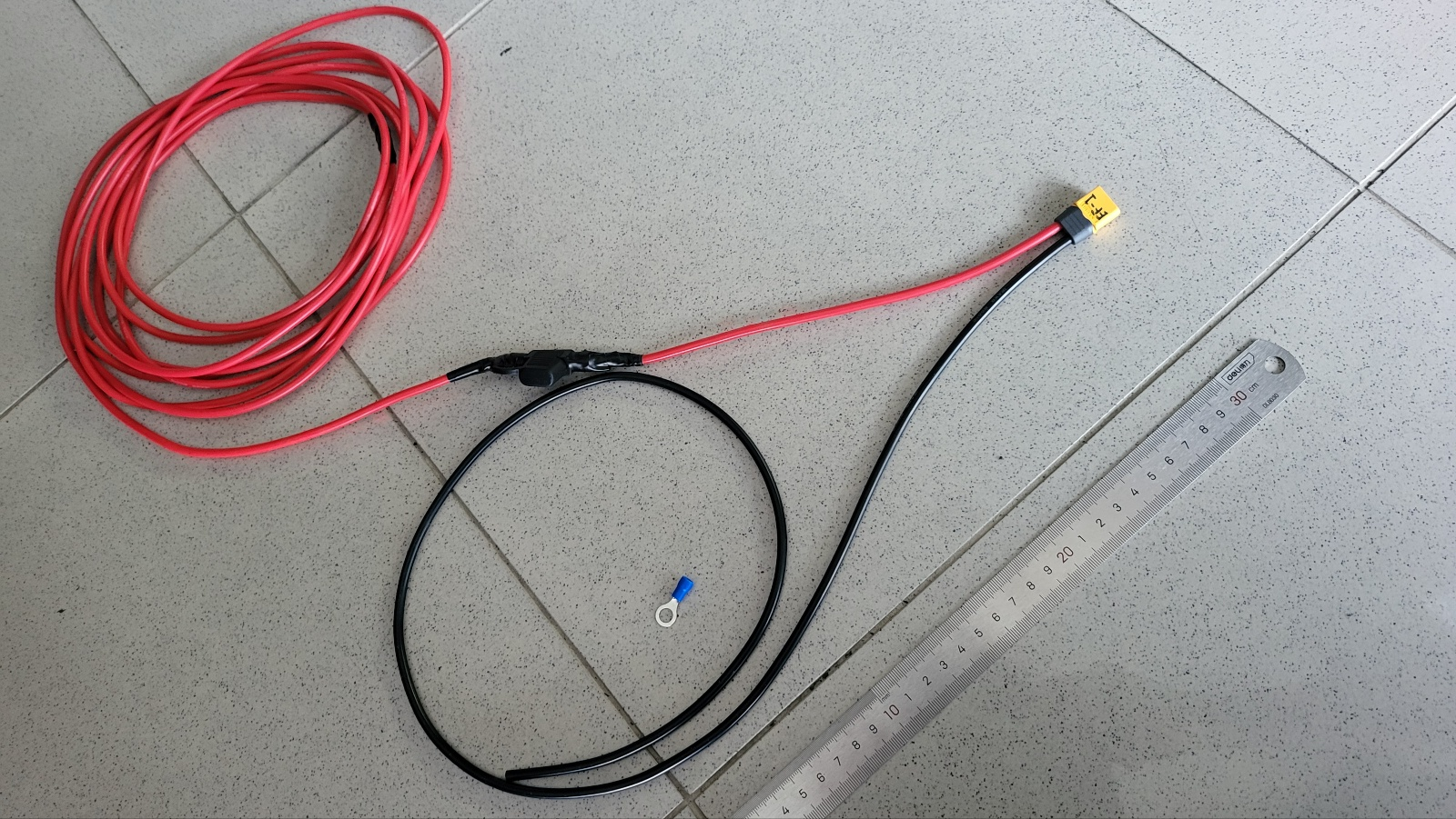 - 실리콘 피복 전선 12AWG 에 XT60 커넥터 수컷 달고, 적색 전선은 약 6m, 검정 전선은 개략 1m , 검정 전선에 연결할 압착 단자. 압착 단자는 차량에서 작업하면서 현장에서 검정색 전선 적당한 길이로 자르고 압착 할 것임.