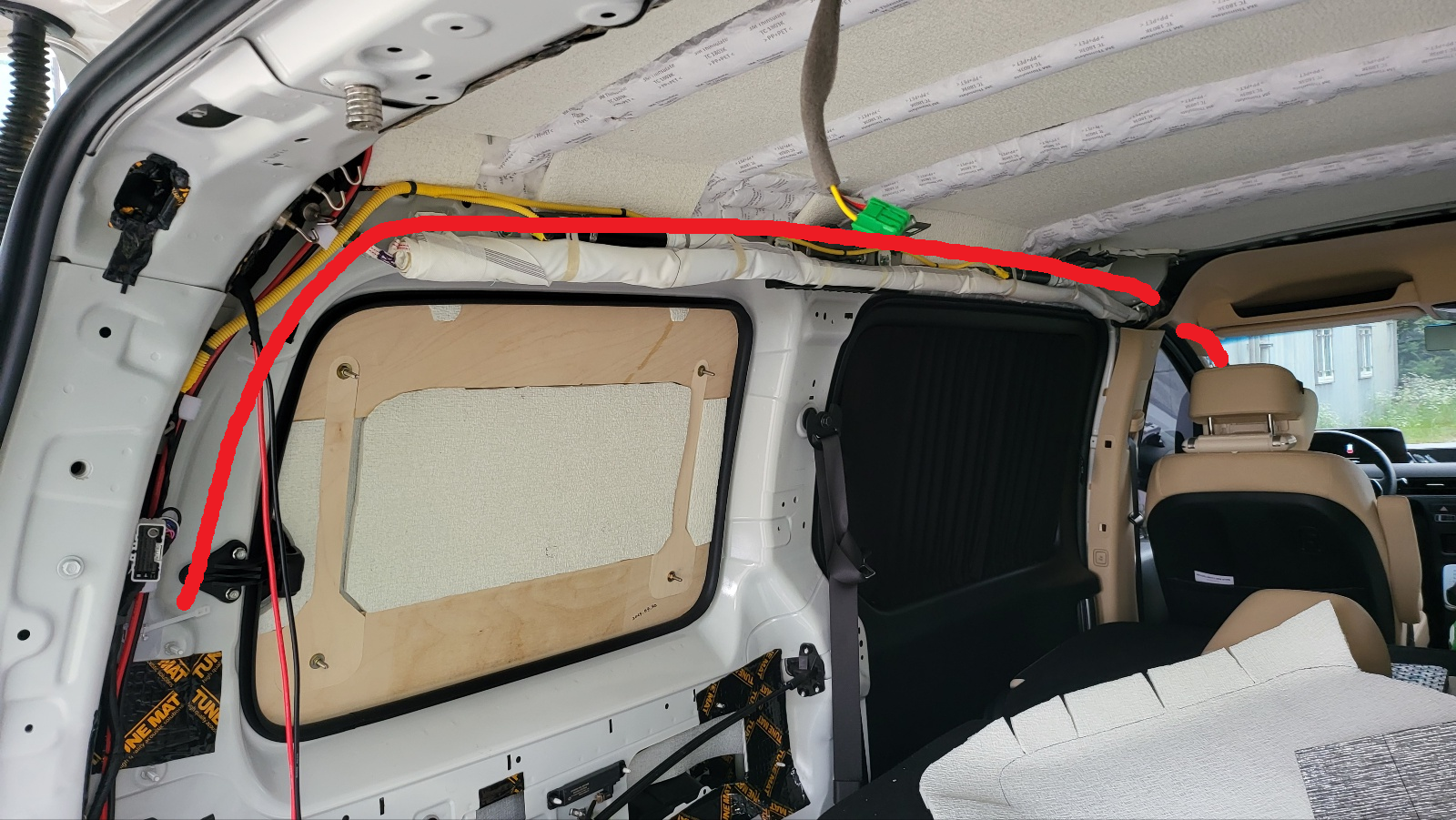 - 아래 붉은색 라인. 트렁크 천장 부분으로 가서 차량 앞부분 의 프런트 필러 까지 가서 핸들 하단 휴즈 박스 까지 보내야함.