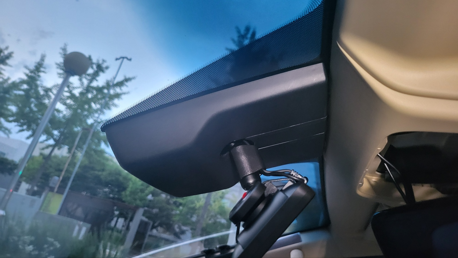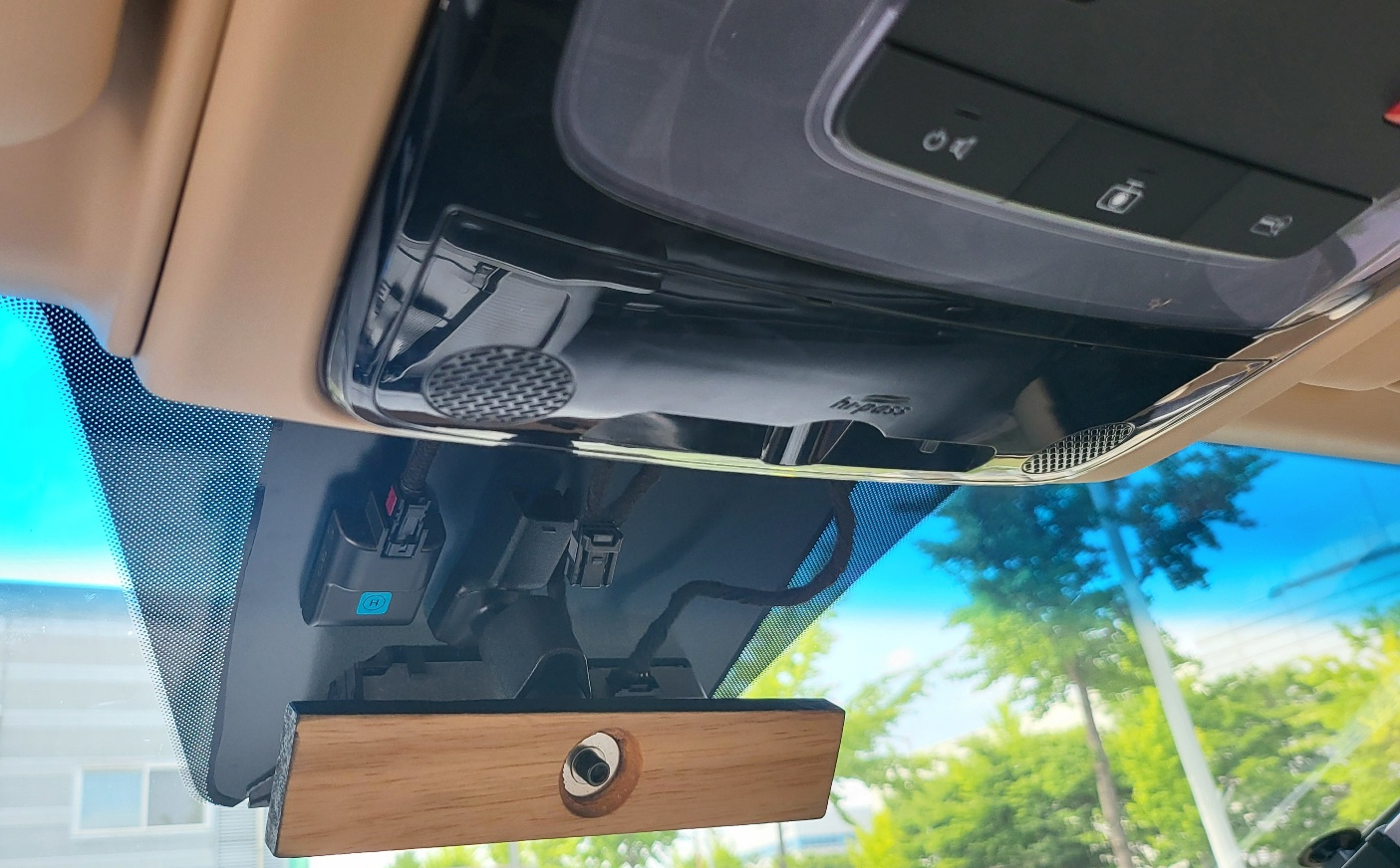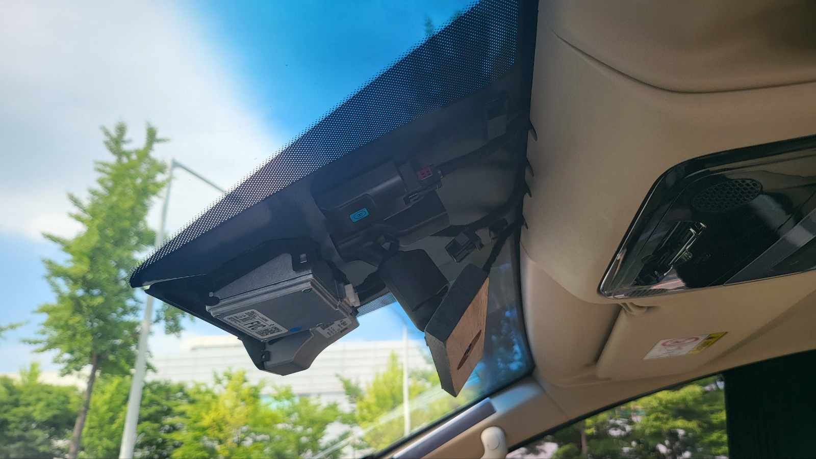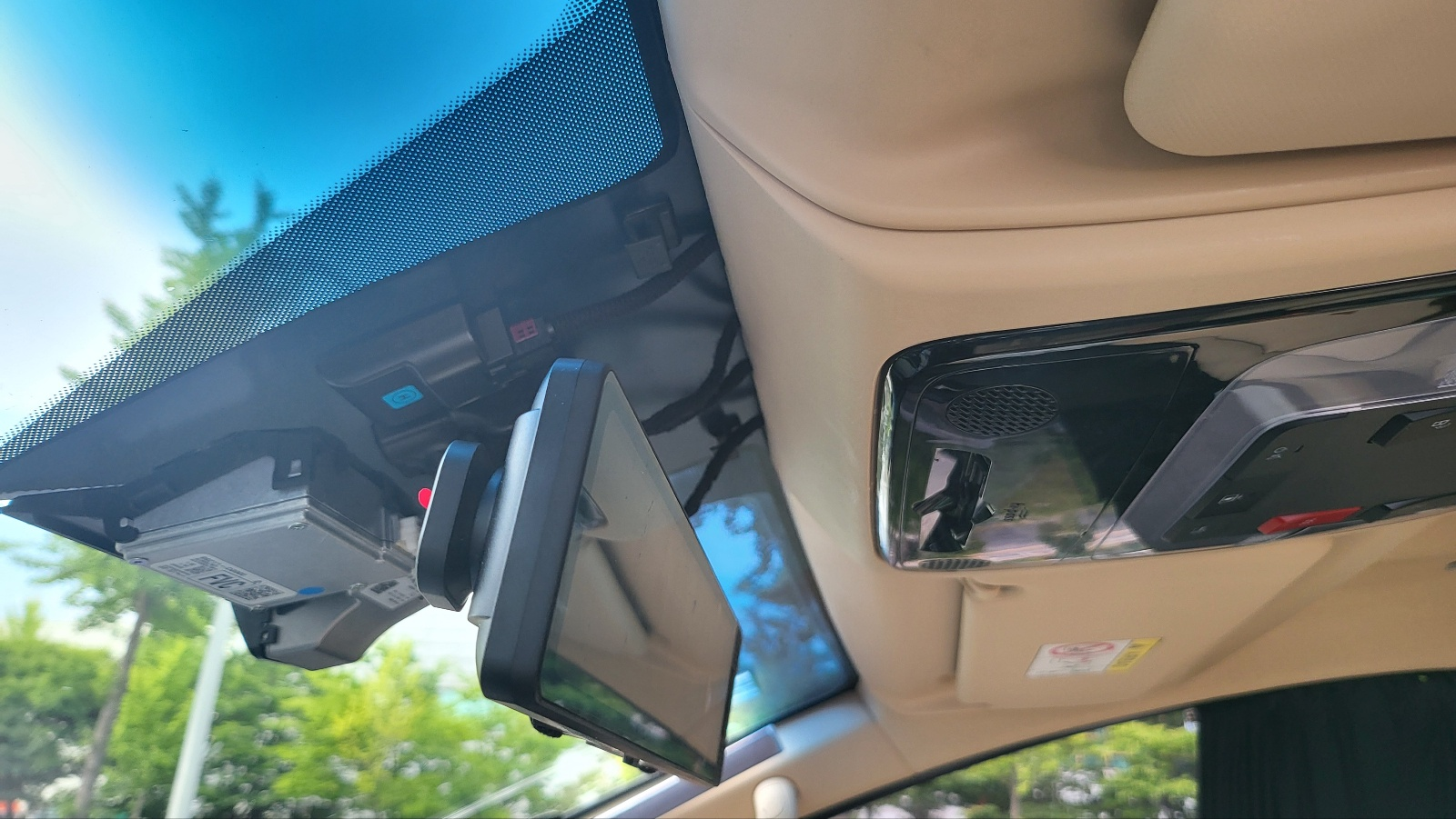 4k 3채널 룸미러형 블랙박스 거치하여 실내 카메라(아래 사진의 오른쪽에 보이는 것)도 전면으로 향하게 하여 "전방 + 우측" 담당하고 , 전방 카메라는 "전방 + 좌측"을 담당하게 하여 초광각 시야각 확보하려고 했는데, 실제 장착 해보면 순정 룸미러와 간섭이 있어 실내카메라가 전방을 향하지 못함.
