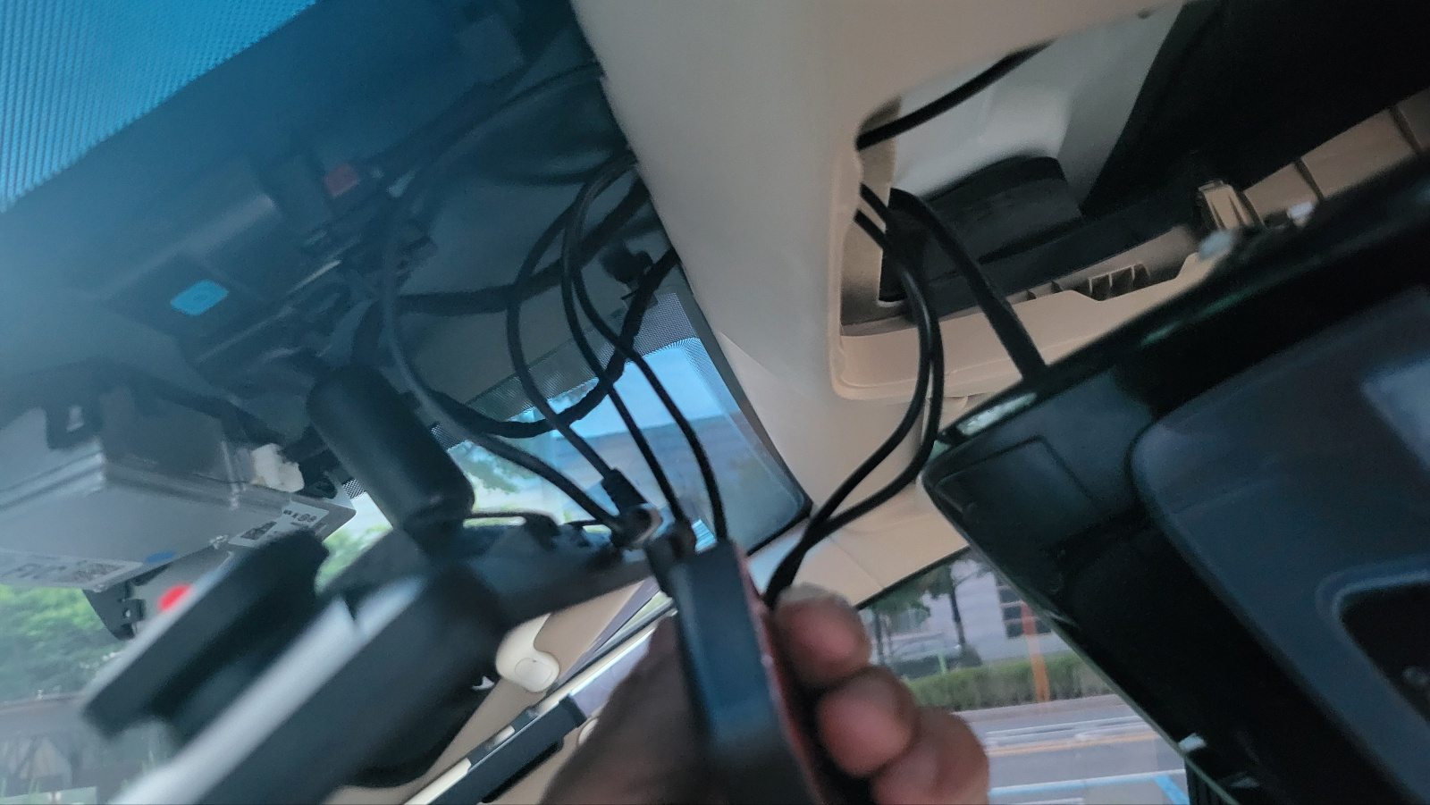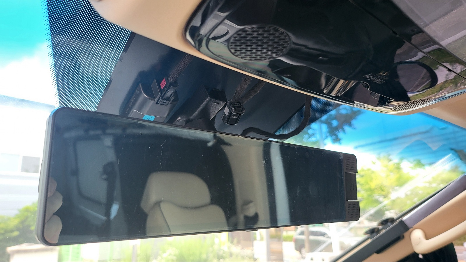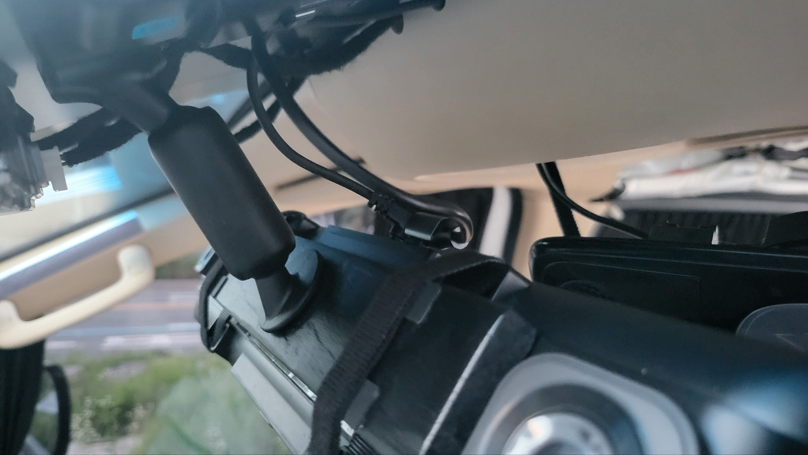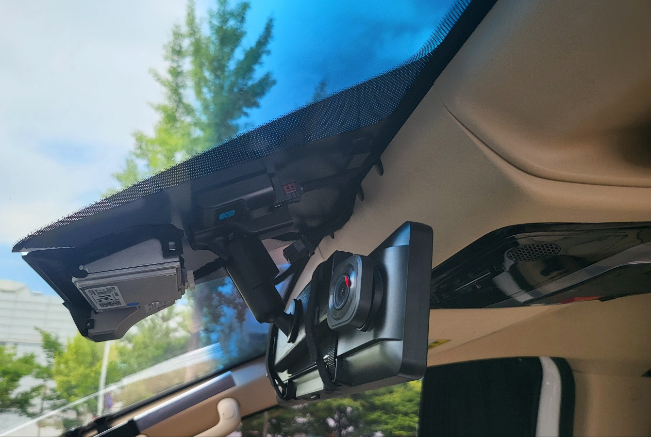 4k 3채널 룸미러형 블랙박스 거치하여 실내 카메라(아래 사진의 오른쪽에 보이는 것)도 전면으로 향하게 하여 "전방 + 우측" 담당하고 , 전방 카메라는 "전방 + 좌측"을 담당하게 하여 초광각 시야각 확보하려고 했는데, 실제 장착 해보면 순정 룸미러와 간섭이 있어 실내카메라가 전방을 향하지 못함.