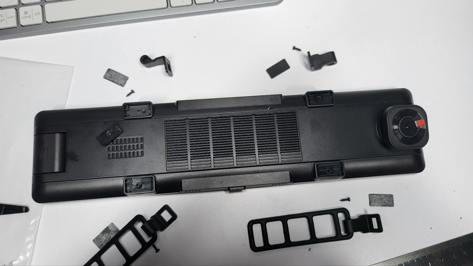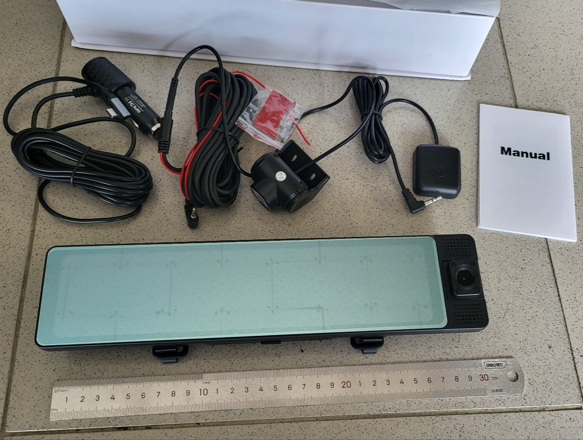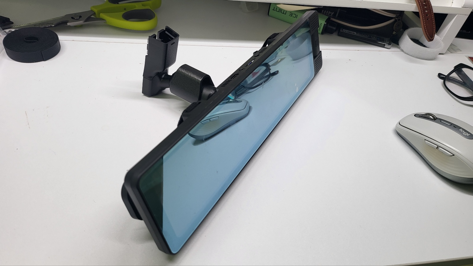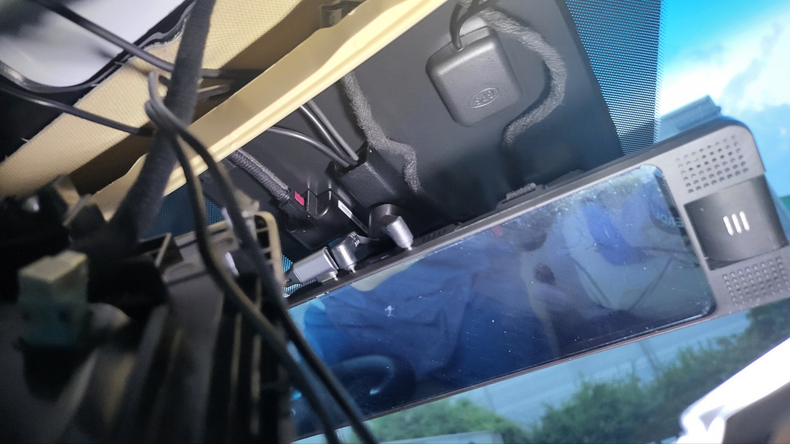 4k 3채널 룸미러형 블랙박스 거치하여 실내 카메라(아래 사진의 오른쪽에 보이는 것)도 전면으로 향하게 하여 "전방 + 우측" 담당하고 , 전방 카메라는 "전방 + 좌측"을 담당하게 하여 초광각 시야각 확보하려고 했는데, 실제 장착 해보면 순정 룸미러와 간섭이 있어 실내카메라가 전방을 향하지 못함.