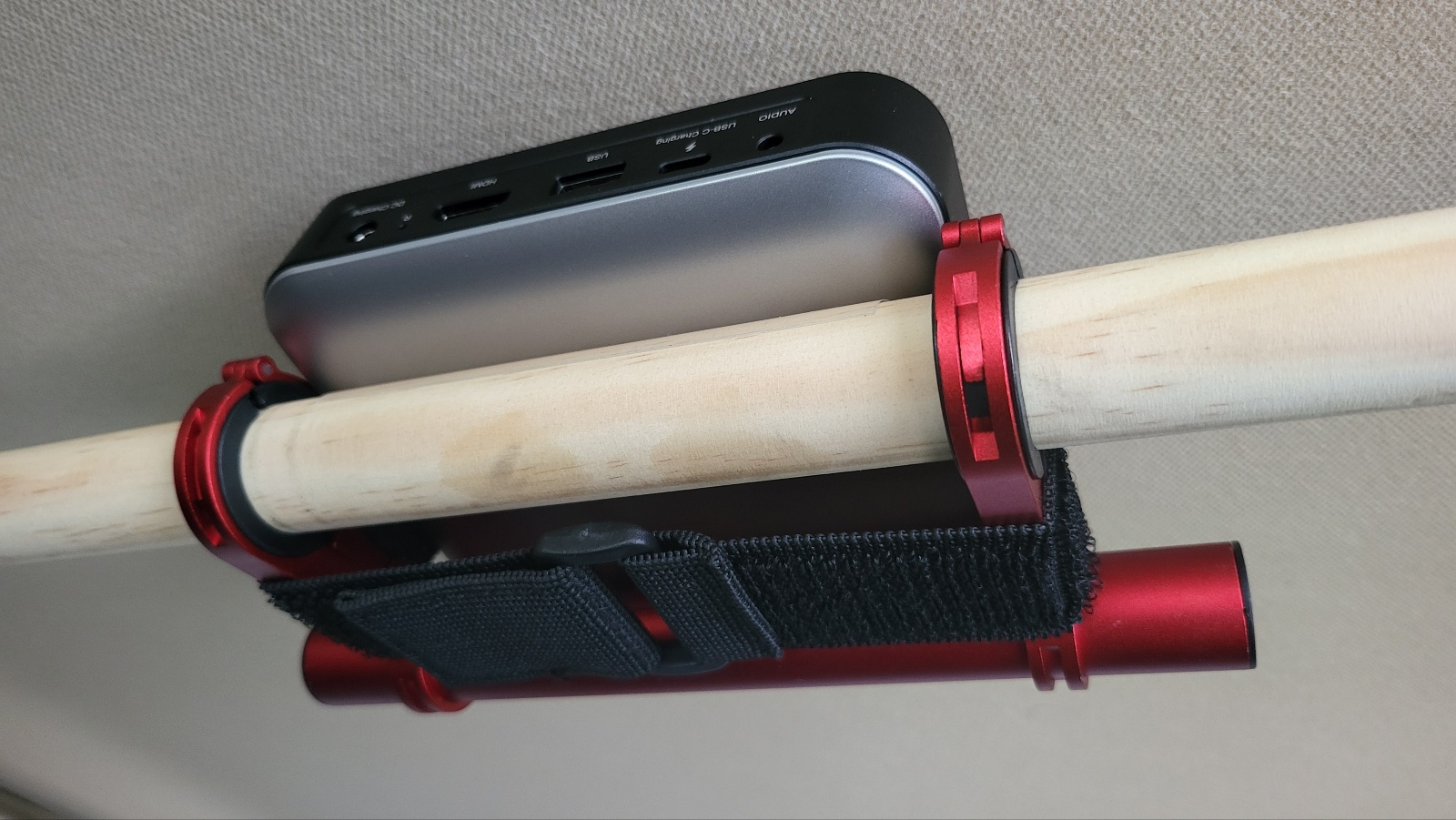 - 앞뒤로 감으면 뒷부분의 USB 커넥터를 벨크로가 가리게 된다. 탄성 벨크로 밴드 ( 폭 3.8cm 길이 30cm ) 로 기기 좌우로 고정하는 방식으로 하면 뒷부분이 모두 개방되어 커넥터 활용에 방해 안됨.