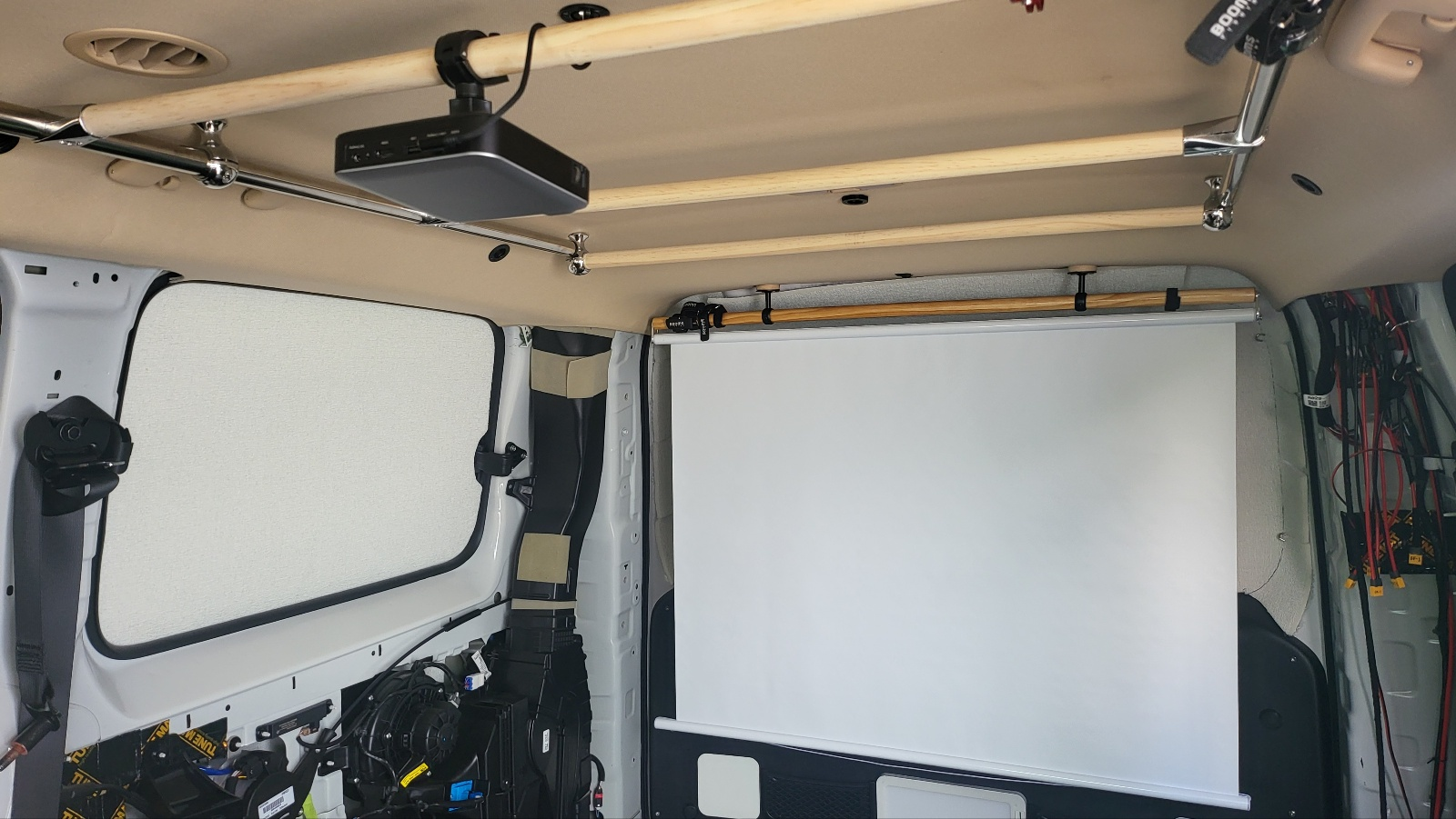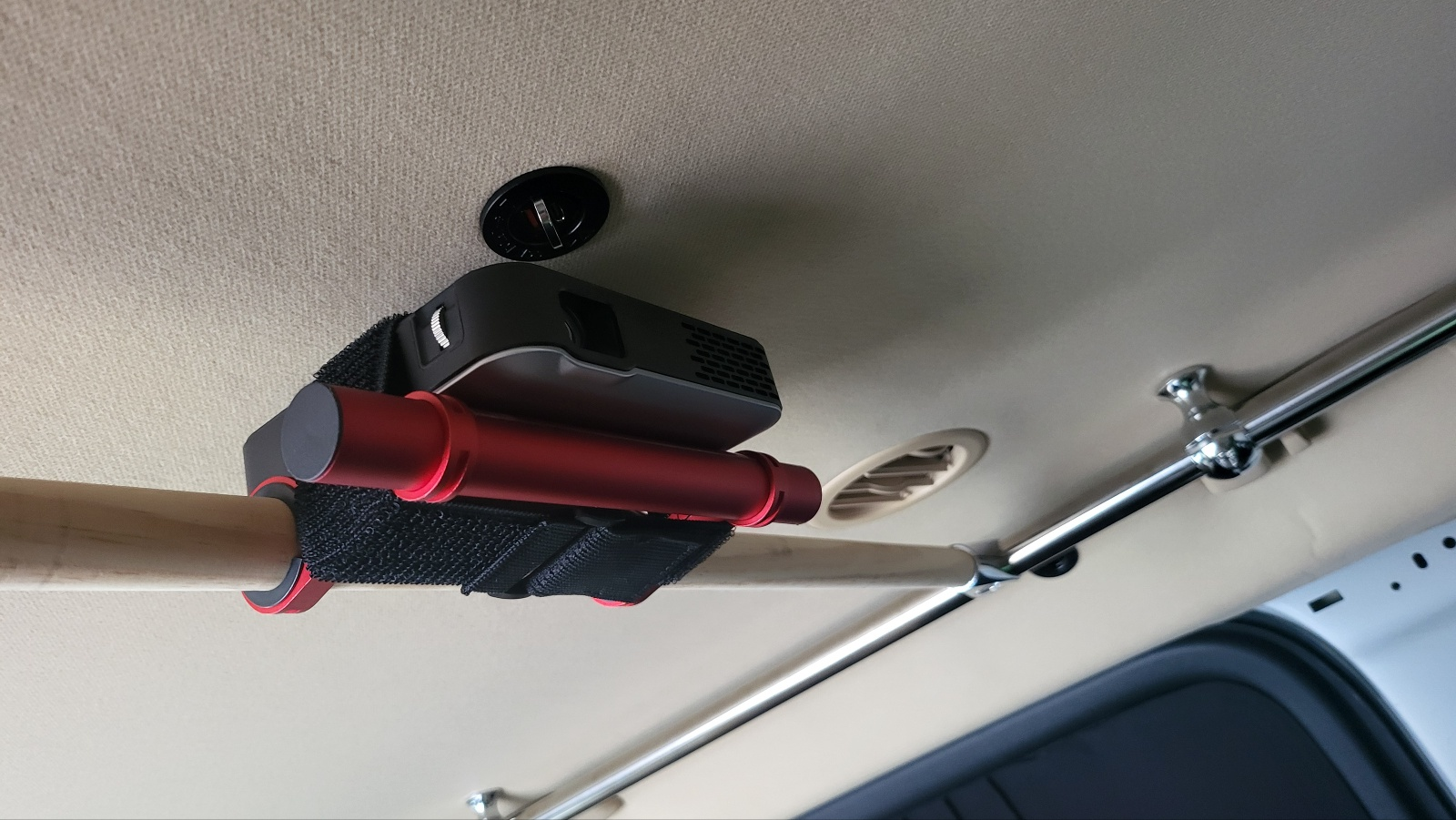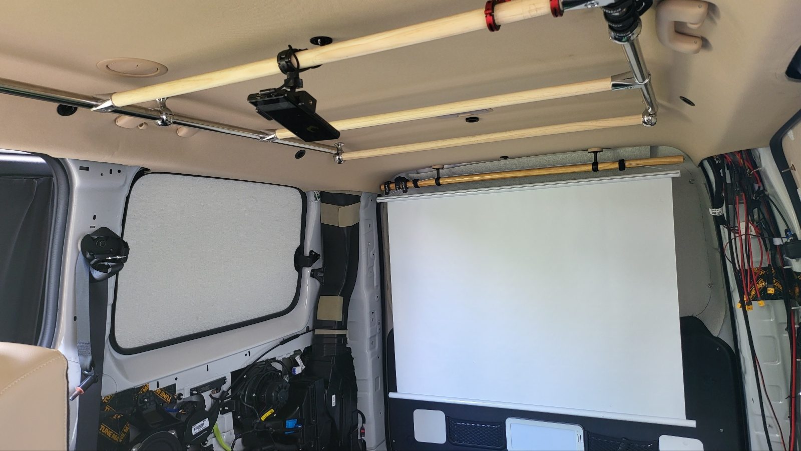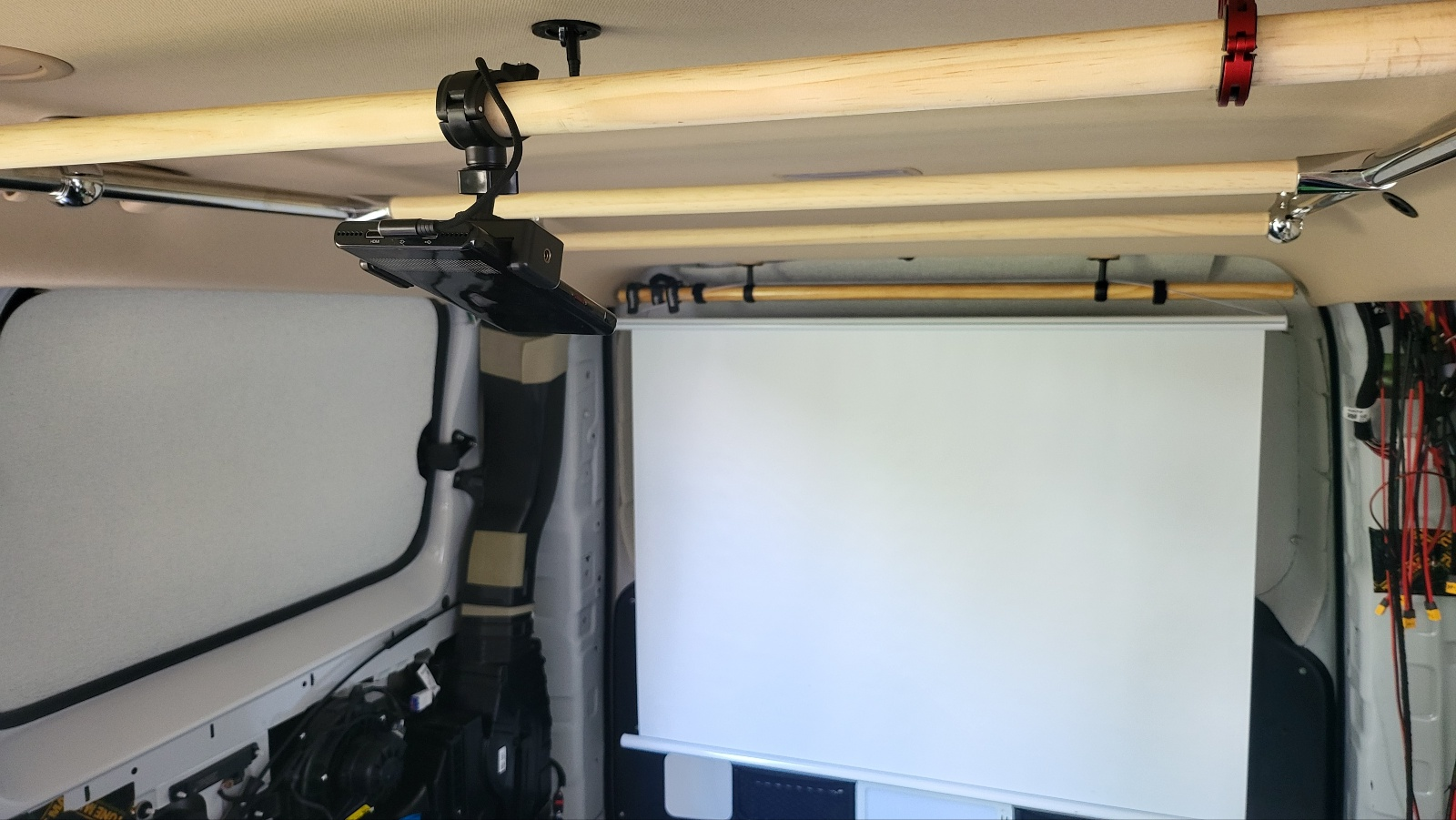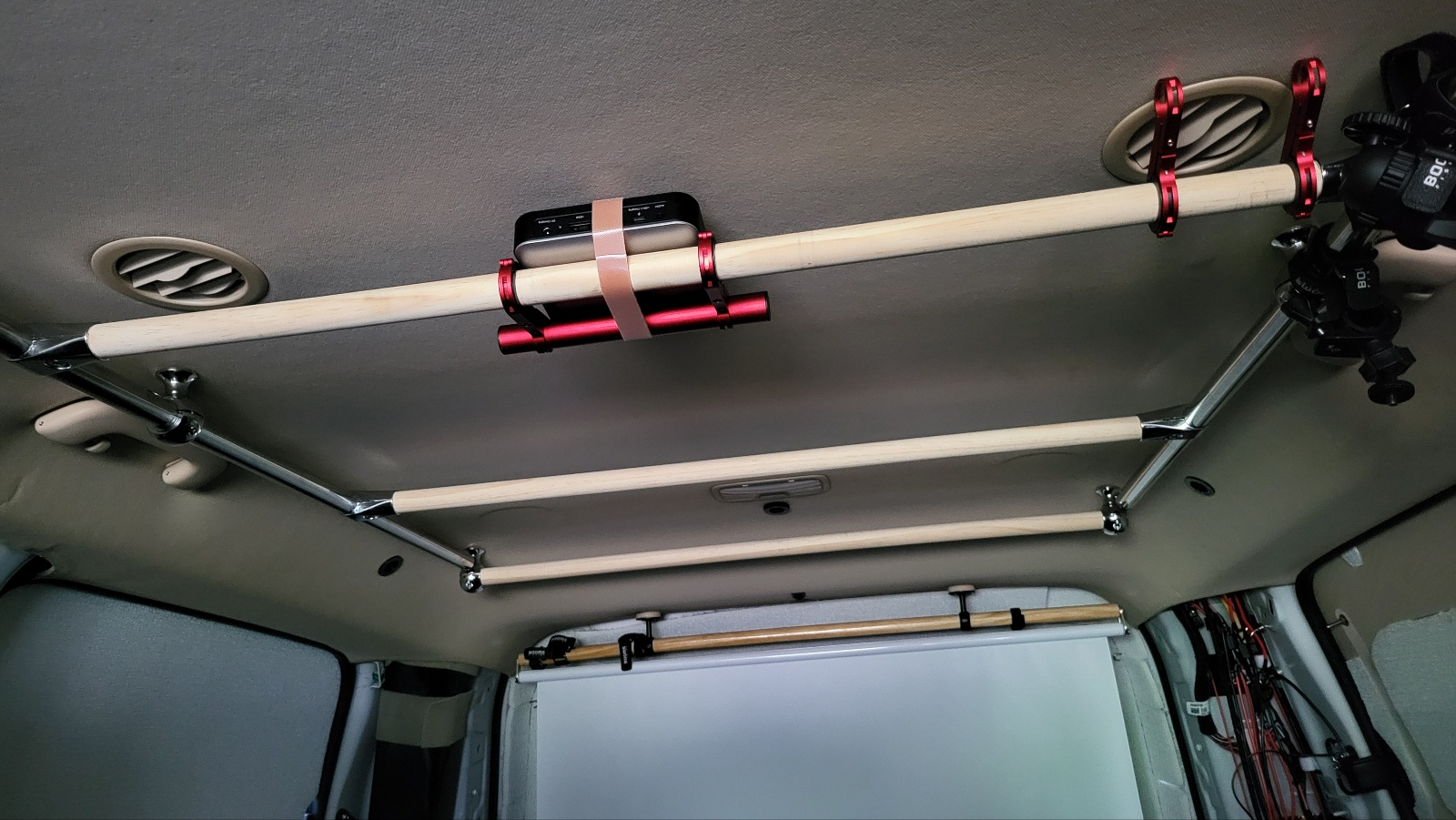빔 프로젝터 스크린 거치 - 사전 작업해둔 트렁크 가로봉 양끝에 벨크로(전선 정리용) 이용하여 50인치(100 cm x 80 cm ) 족자형 스크린 간단 고정 스크린 거치시 아래같은 구조로도 해