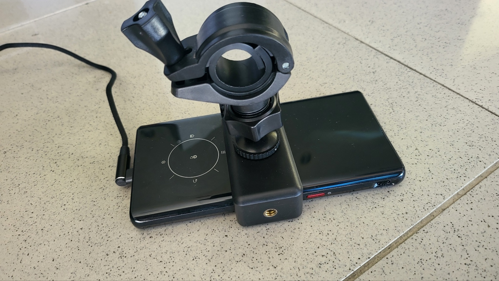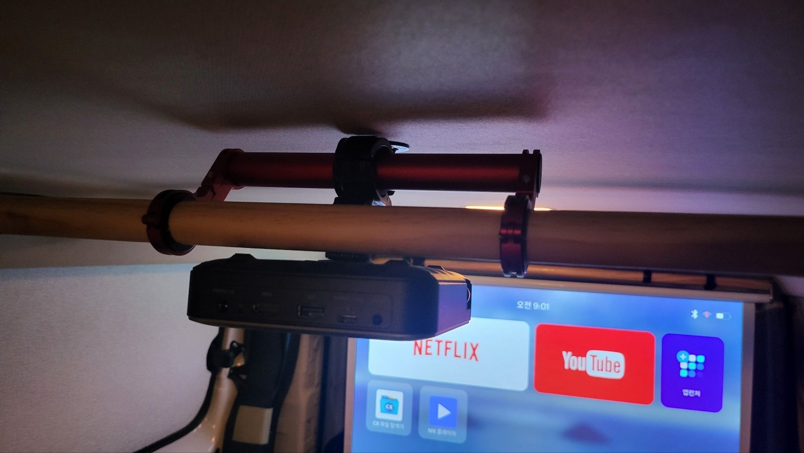원통 거치 가능한 브라켓에 스마트폰 거치홀더 연결하고, 초박형 빔프로젝터 (실 해상도 800x480)장착