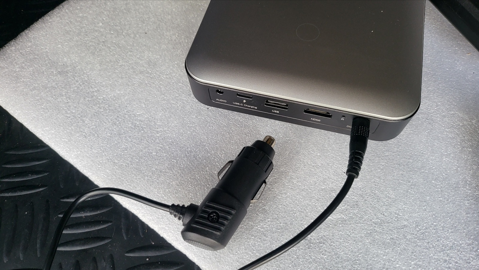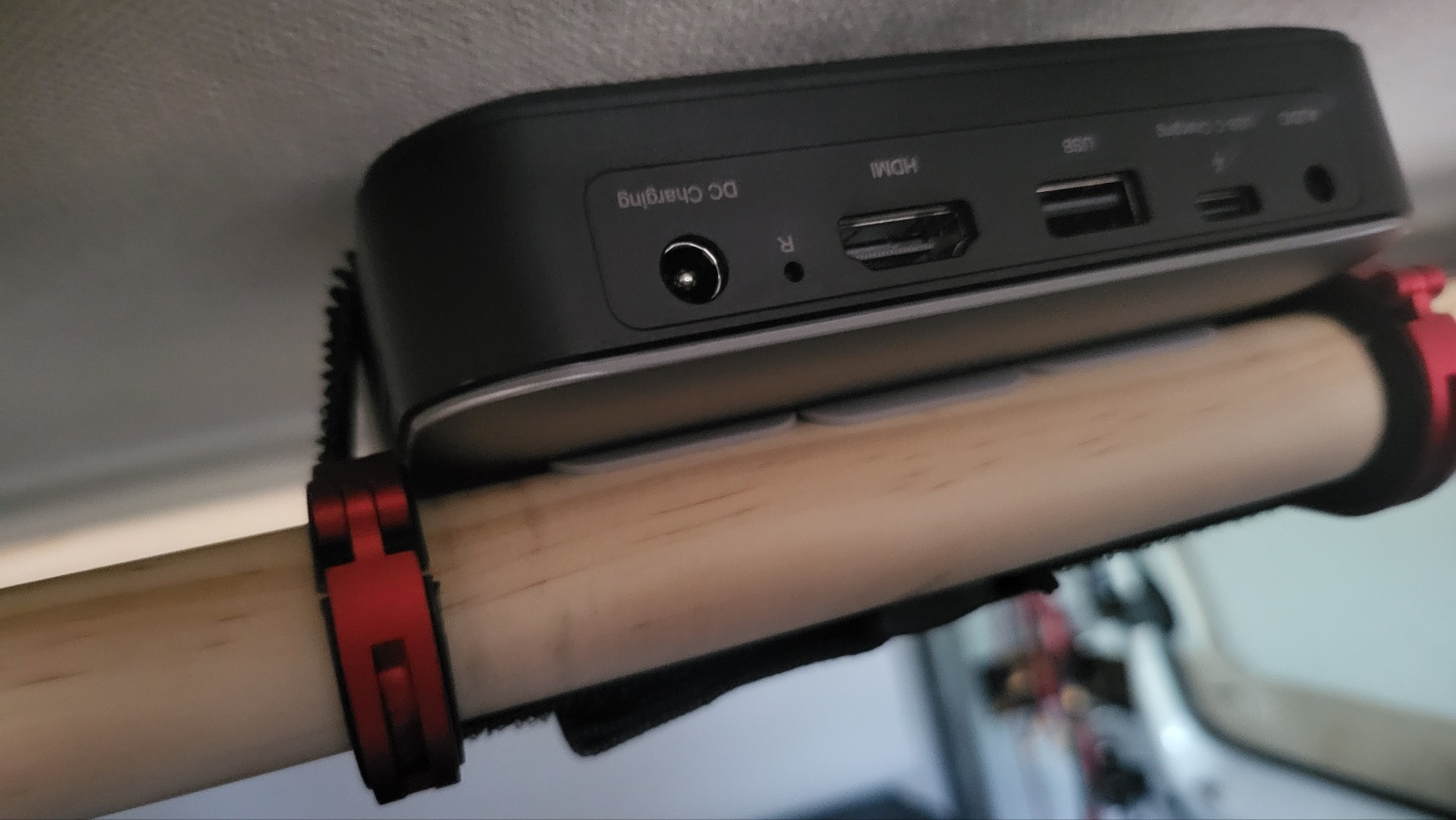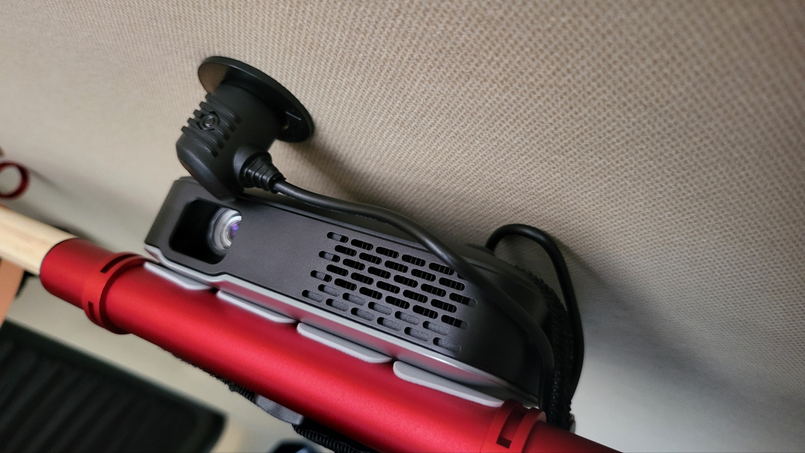 - USB-C 로 전원 공급가능하므로 천장에 매립해둔 시거소켓에 USB 충전기 이용하여 컴팩트한 셋팅 달성가능. 계획은 이랬는데 시거소켓 장착형 USB 충전기로는 프로젝터에 전원공급이 안되길래 시거잭에 DC 플러그 연결하여 12~14V 직접 공급하는것으로 구현함(아래 상세 설명 있음).