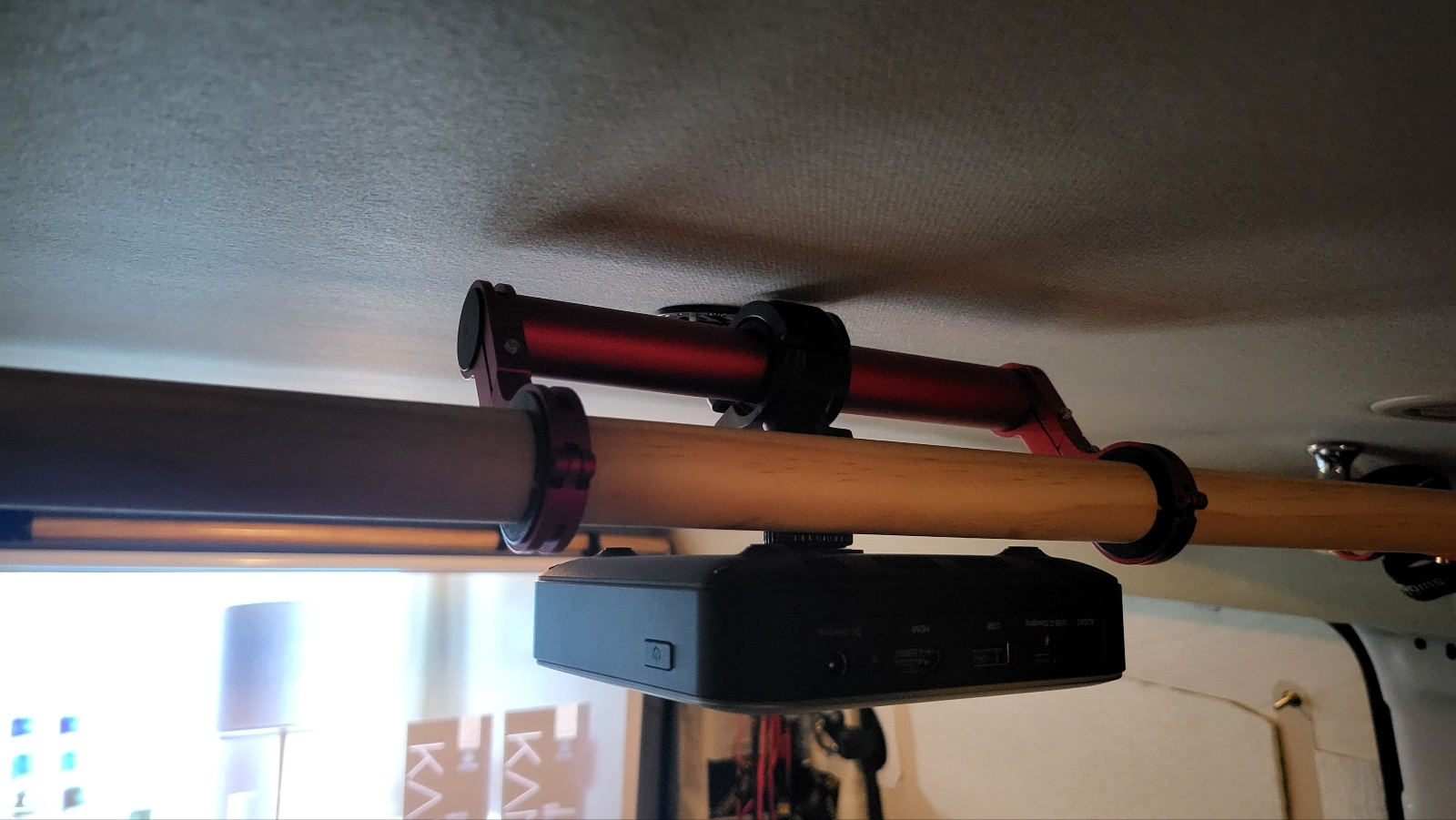 - 볼트 이용하여 체결하는 브라켓 이용하지 않고 빔 프로젝터를 직접 봉 위에 올려두고 벨크로 타이로 고정.