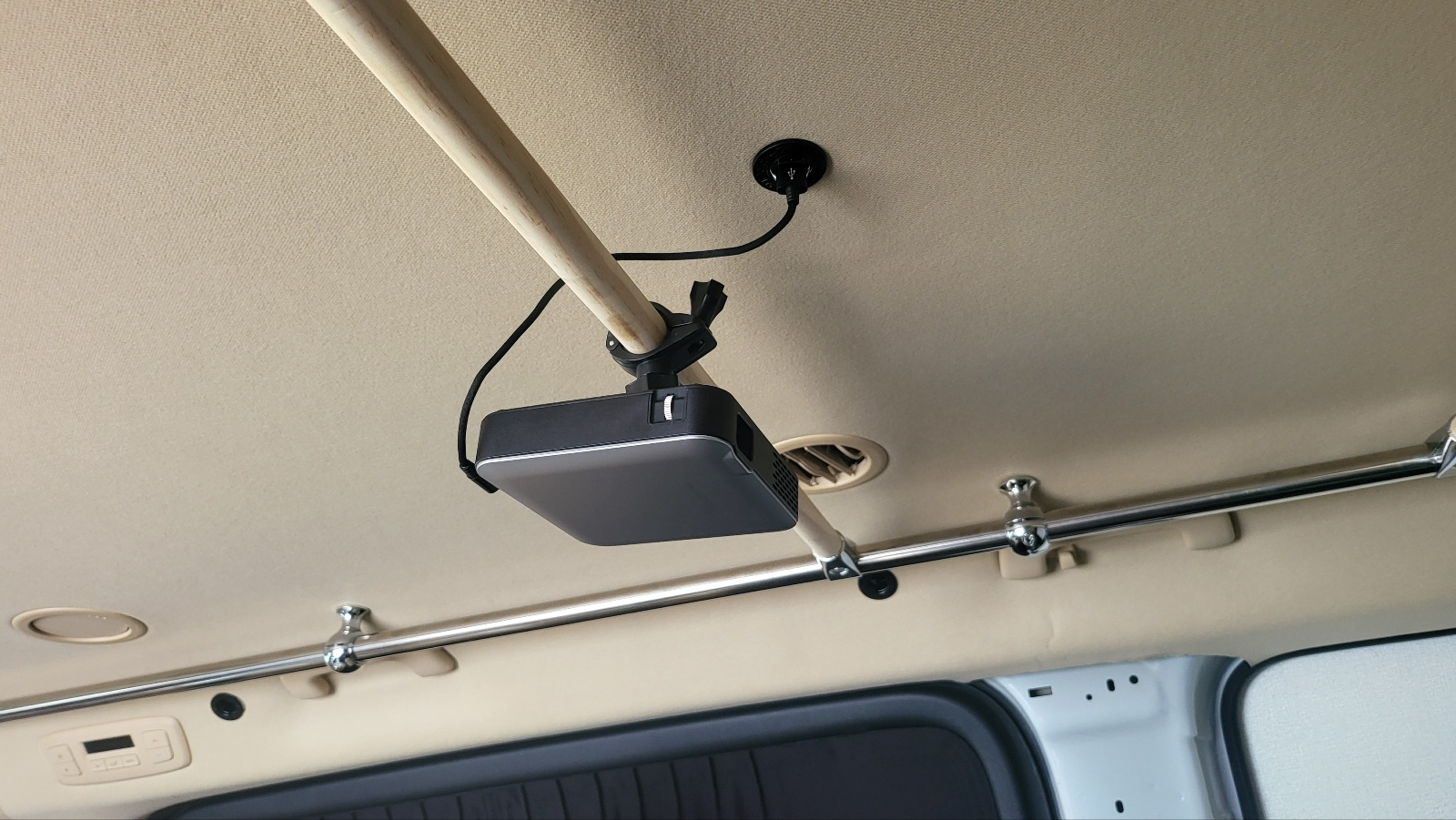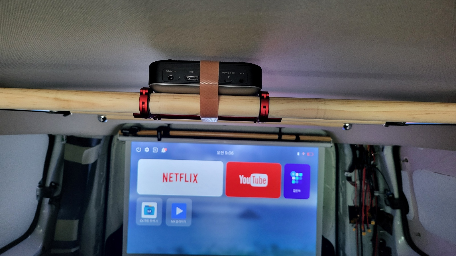 차량 천장에 마련해둔 시거소켓에 연결하여 프로젝터로 전원공급 셋팅완료.