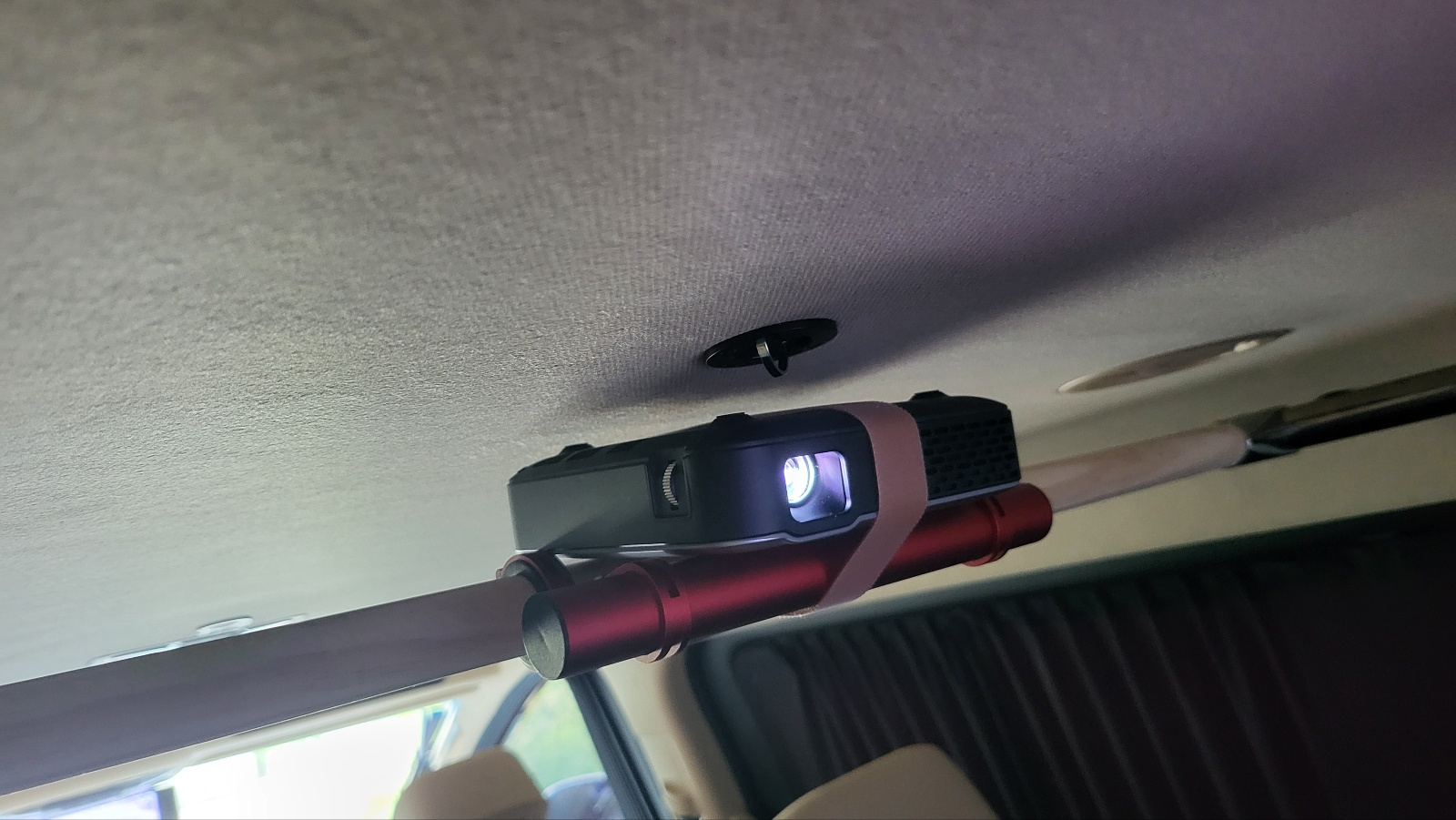 차량 뒤쪽에 거치해둔 50인치 스크린 방향으로 투사. 저 거리에서 투사하면 딱 맞음.