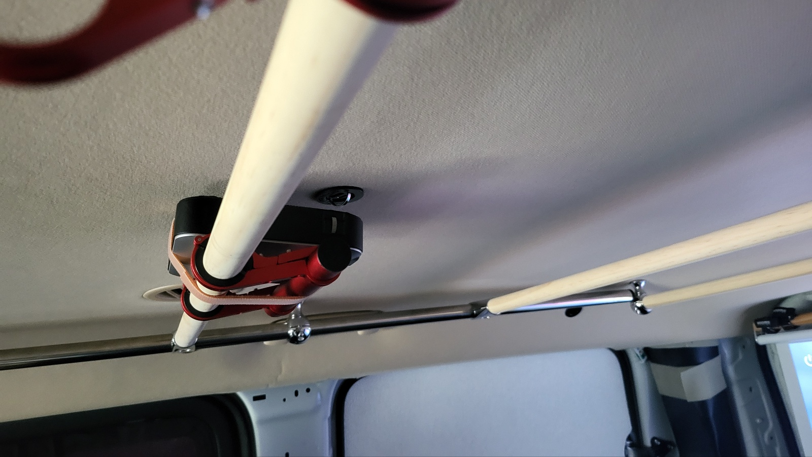 - 자전거 핸들 확장바를 가로봉에 달아 확장바에 거치대를 달았다. 앞의 방식보다는 돌출 많이 줄였다.