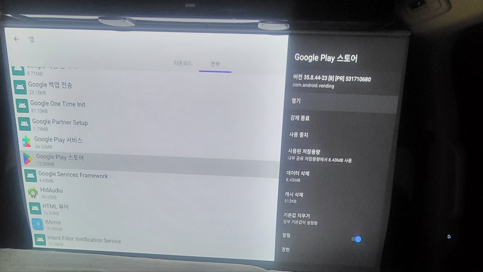 설치 되어있는 여러 앱들이 보인다. 이 중에서 Google Play 스토어 선택하고 오른쪽 메뉴에서 열기 선택한다.