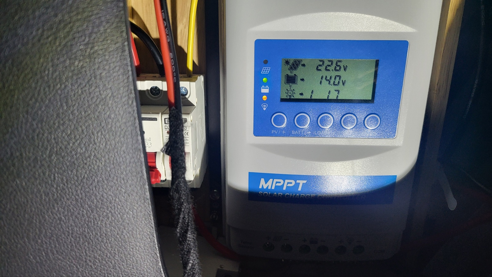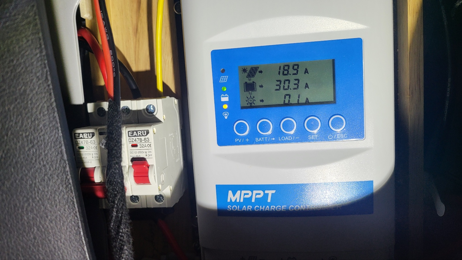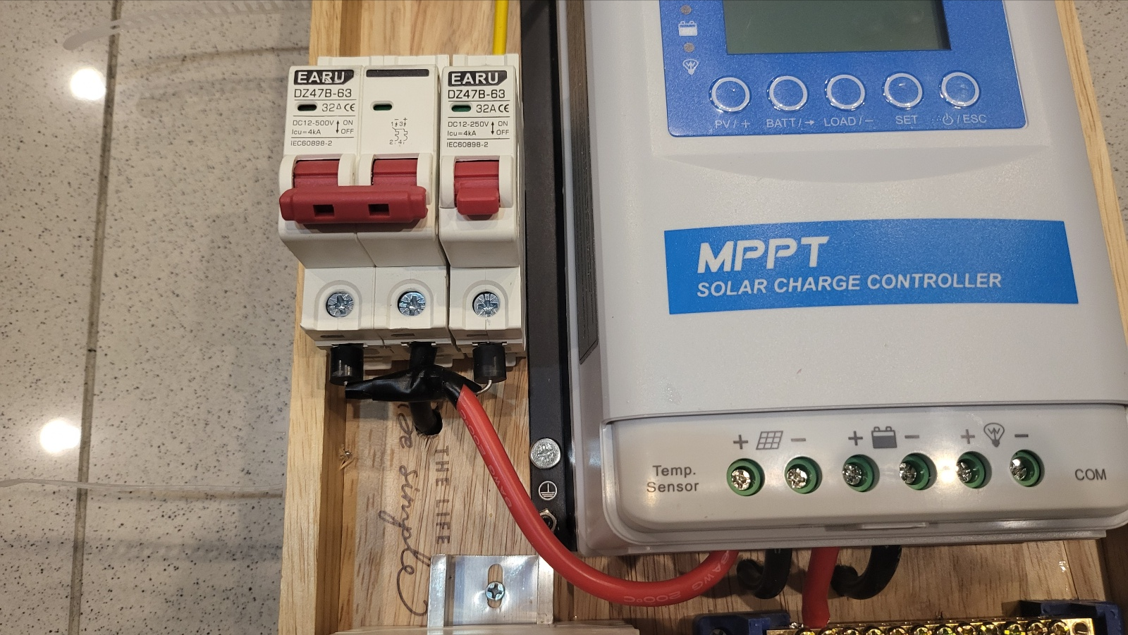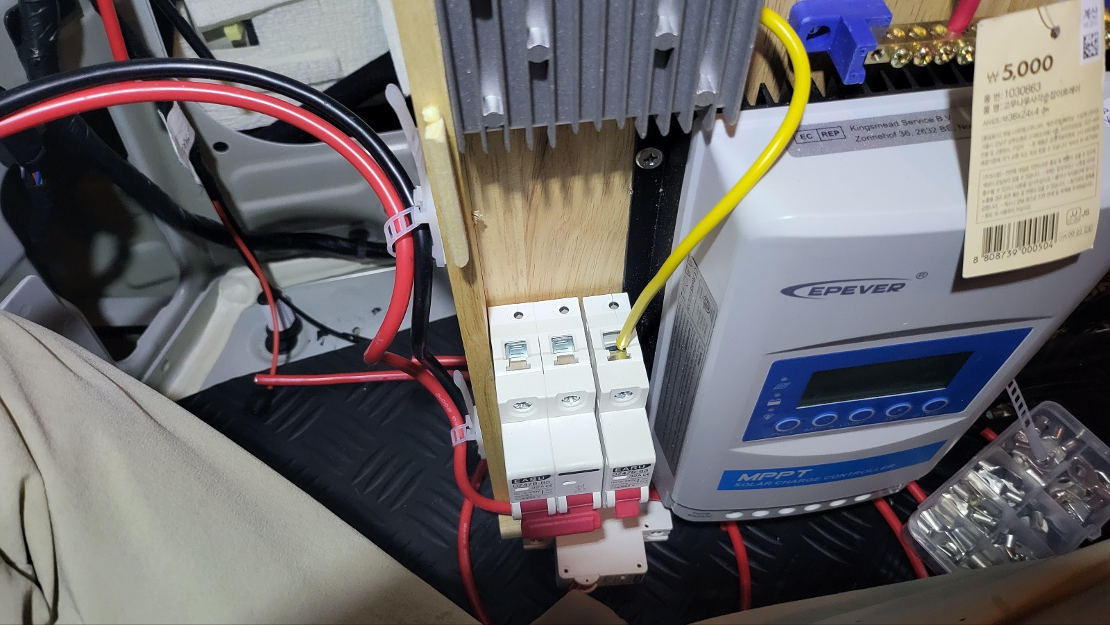 - MPPT 왼쪽에 직류 과전류 차단기 2개가 있고, 2P 차단기로 태양광 패널의 출력 (+), (-) 모두 차단 가능하게 했고, 1P 차단기는 12V to 24V 컨버터 (+) 차단용으로 사용.