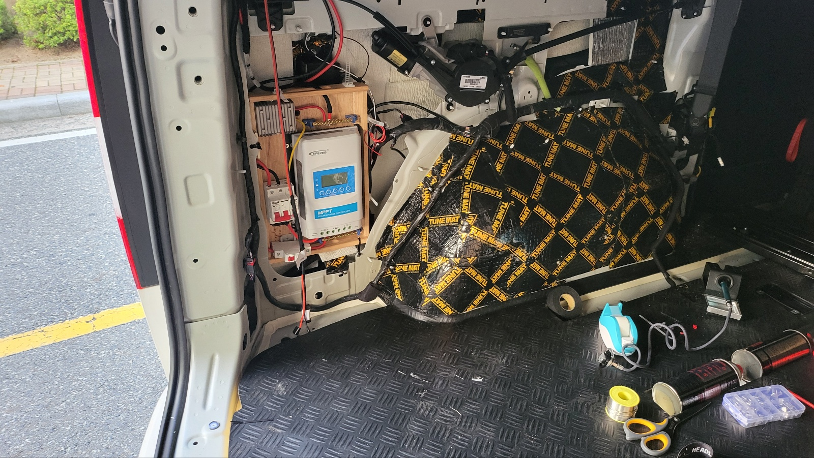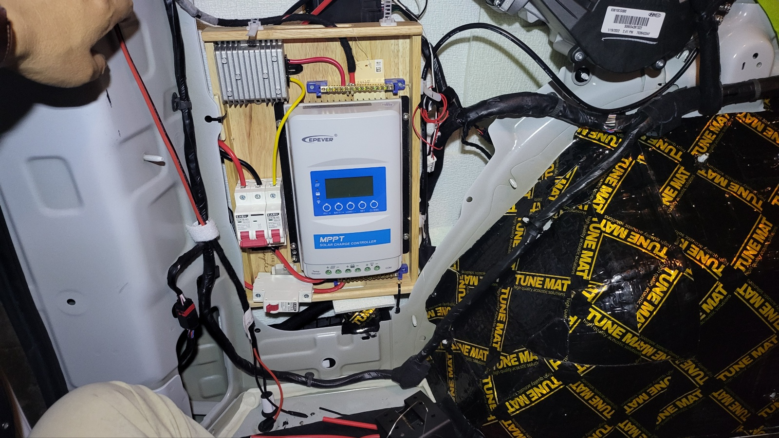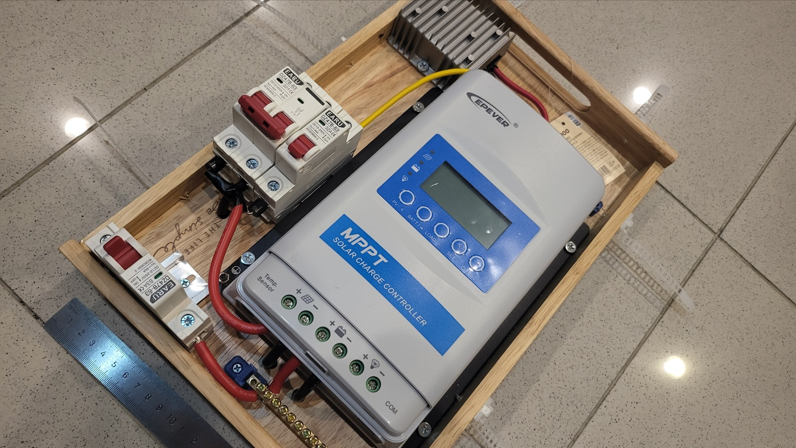- 다이소에서 고무나무 사각 손잡이 트레이 구입하여, 이곳에 MPPT 와 주행 충전용도의 승압기 , 차단기 장착한다.