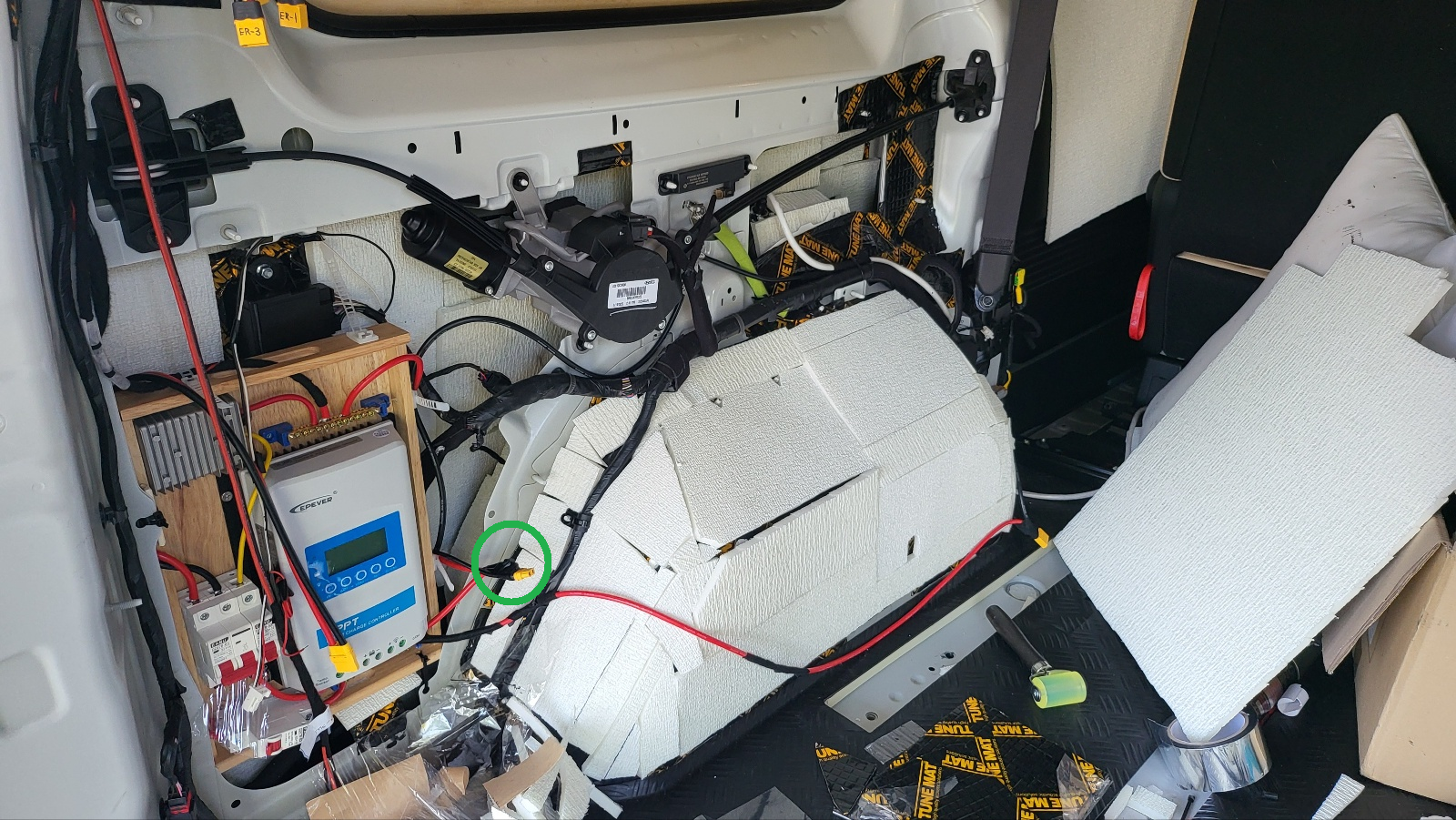 - 충전 박스의 하단은 차량에 있는 철판 위에 얹혀있고, 동시에 왼쪽, 하단 오른쪽에 차체 철판에 있는 구멍 2곳이용하여 타이로 고정하면 주행 중에도 전혀 요동 없이 안정 장착됨.