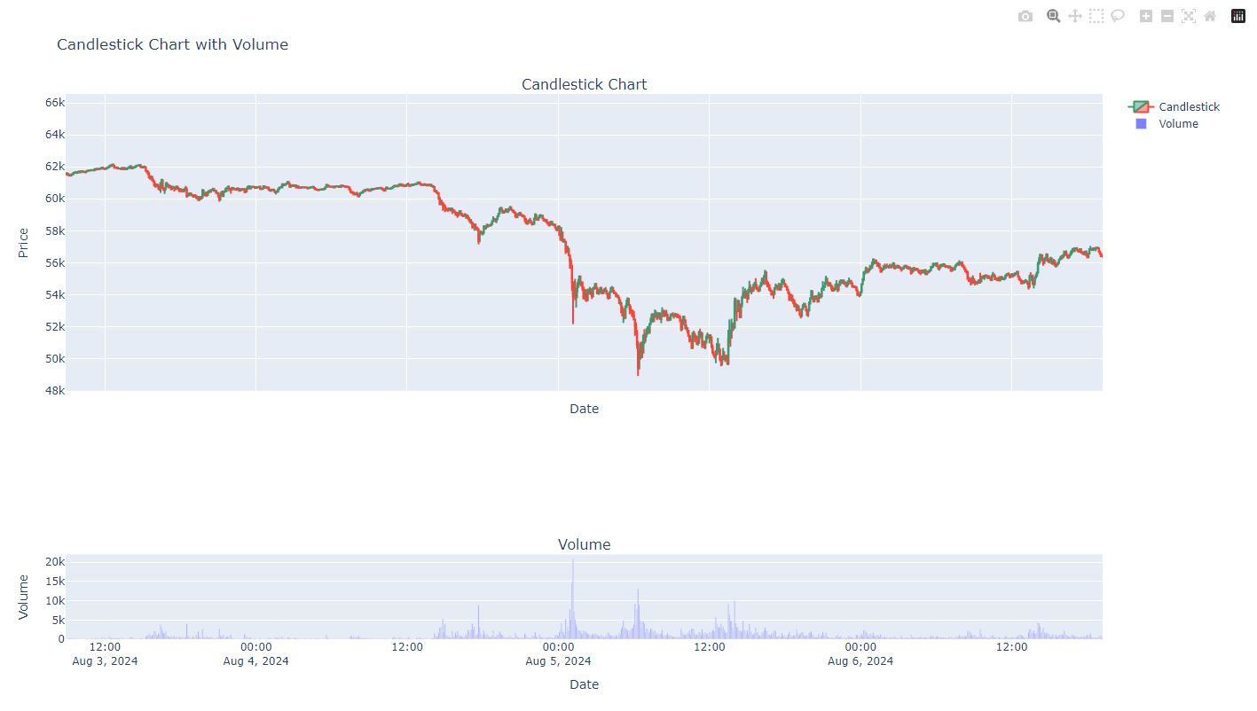 - make_subplots를 사용해 두 개의 서브플롯을 생성. 첫 번째는 캔들 차트, 두 번째는 거래량 차트.