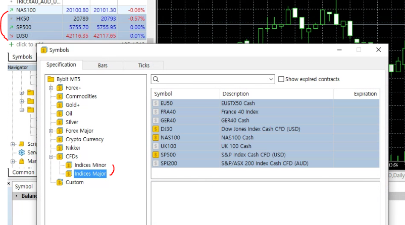 - 암호화폐, FX, 골드, 오일 등은 MT5에서 거래 가능하나 나스닥, S&P 등은 가격 등은 볼 수 있으나 거래 비활성화되어 있음.