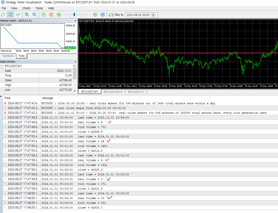 위 설정을 했음에도, BTCUSDT, ETHUSDT 모두 실거래에서 발생했던 틱 데이터가 아닌 시뮬레이티드 틱으로 전략 시험 진행된다.