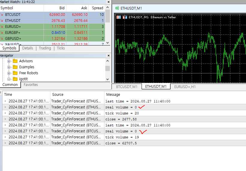 한편, Strategy Tester (전략 테스터)에서 동일 코드 실행시켜보면 실 거래량 정보 정상적으로 제공되고 있다.