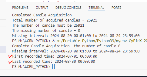 - 본 코드 실행 마지막 시점에, 테이블 기록된 내용 점검하여 누락된 캔들이 있는 경우 해당 시구간을 보여준다.