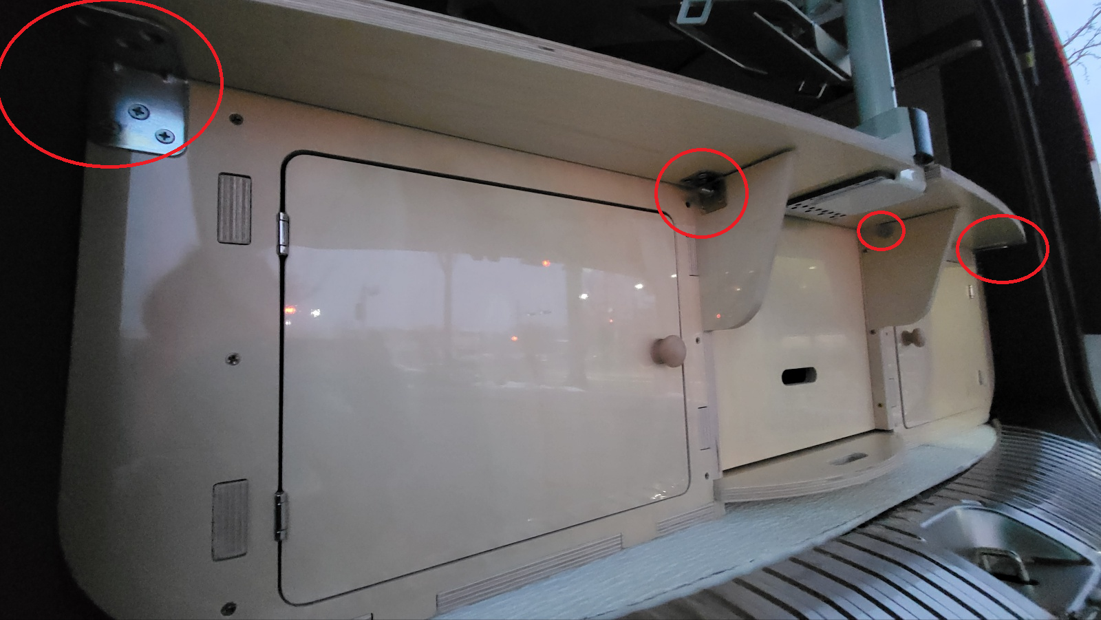 - 트렁크 끝 부분에 있는 판은 원래 나사못으로 앞의 나무 부분과 고정하게 되어있는데, 아래 붉은색 원 부분 처럼 ㄱ 자 꺽쇠 이용하여 강도 보강과 동시에 분해 재조립 용이하도록 볼트로 고정되게하였다. 끝단 2개는 상판에 나사못 고정하지 않았음.
