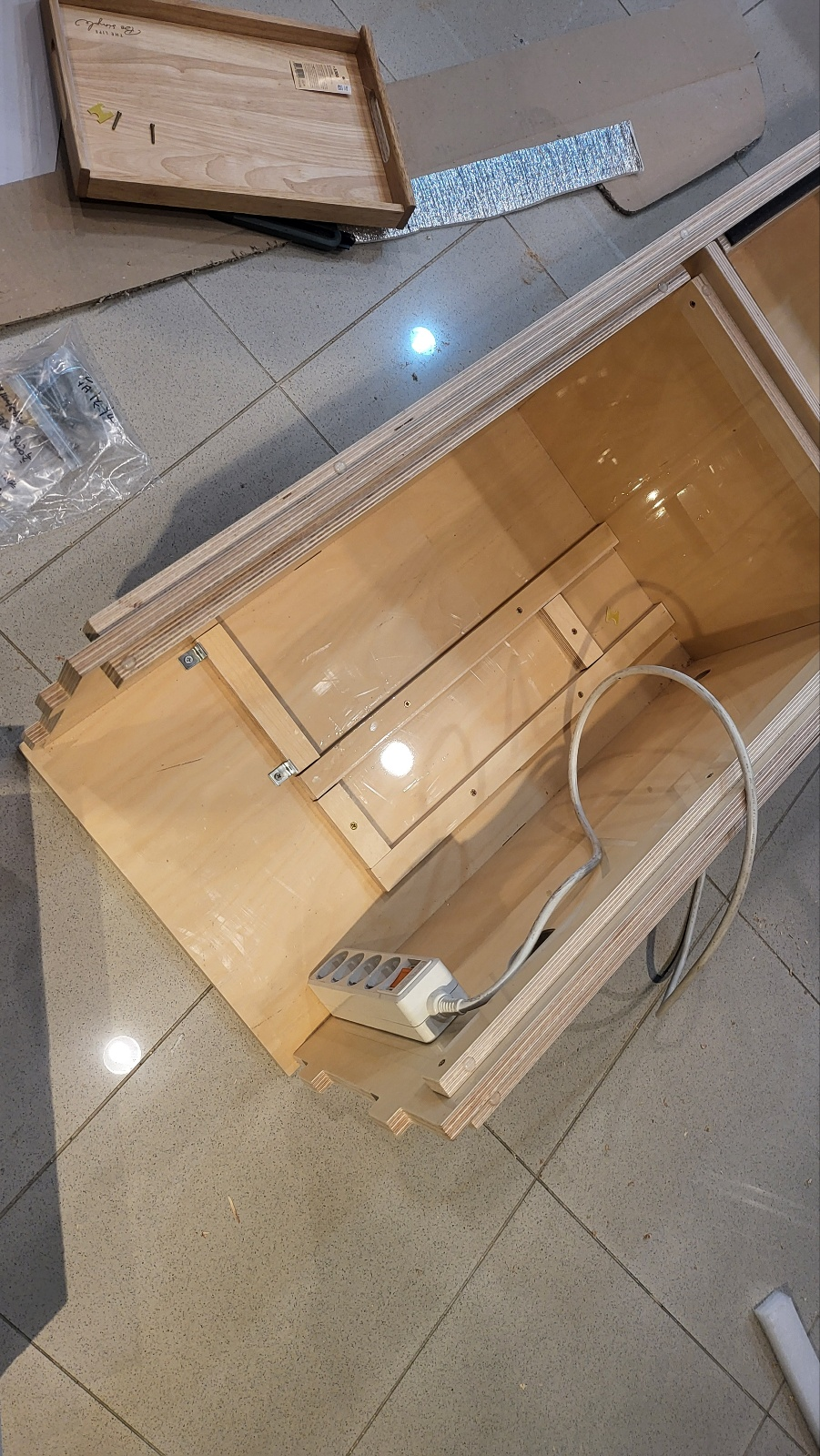 220V 멀티탭 사용하기 위하여 바닥 부분에 구멍내고 아래 사진처럼 멀티탭 배선을 끼울 수있게 하였다.
