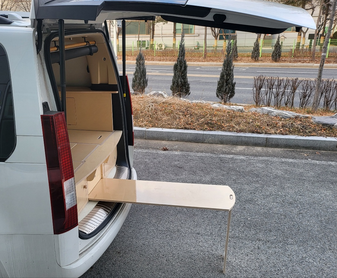 - 테이블 끝자리에 의자 배치해도 테일 게이트 내부에 모두 들어온다. 후방텐트 설치시 적당한 여유 공간 확보됨.