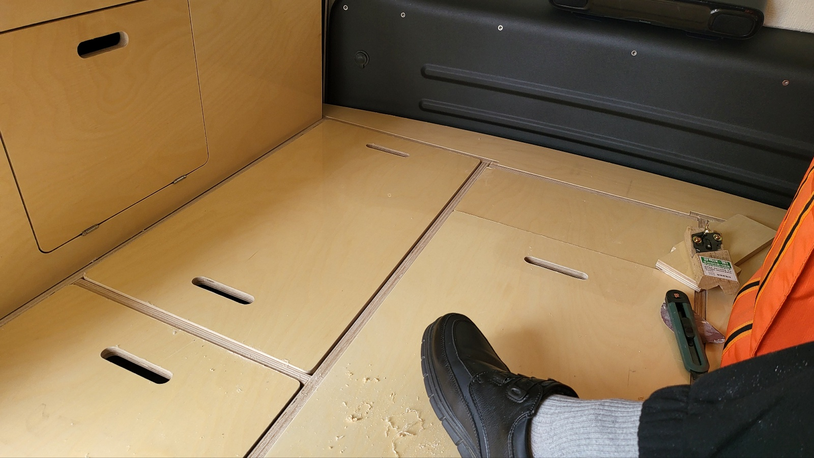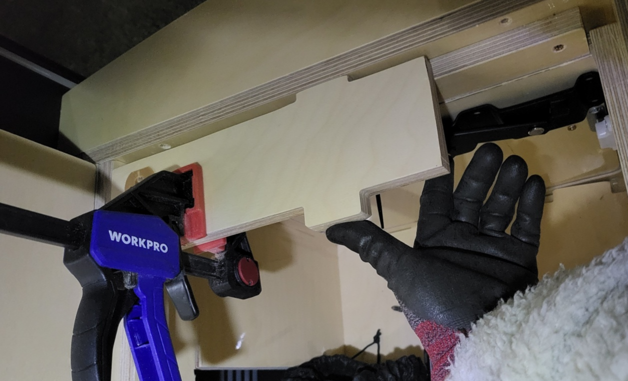 침상 에 힌지 부착할 부분이 없기에 추가로 침상 재료와 동일한 자작나무 합판 두께 15mm 잘라 힌지 장착할 곳에 먼저 부착해둔다.