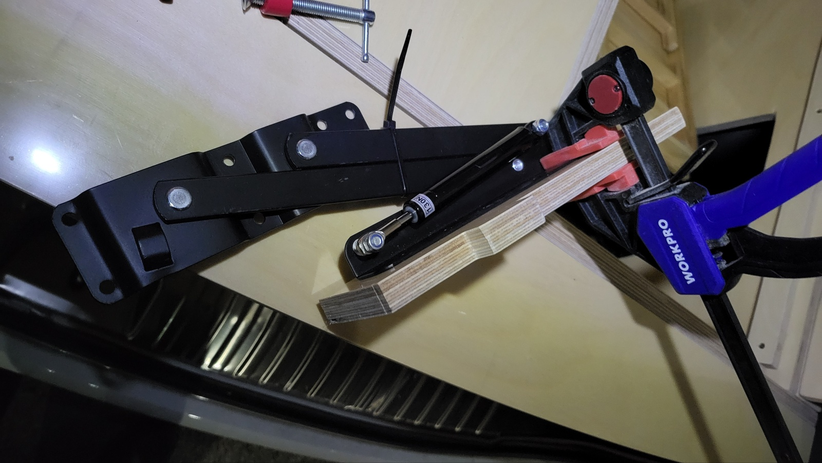 접어진 상태의 힌지에 상판테이블 대용 작은 합판을 클램프로 고정 한 상태에서