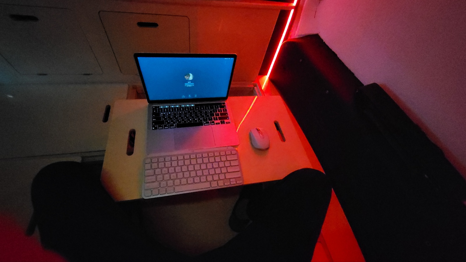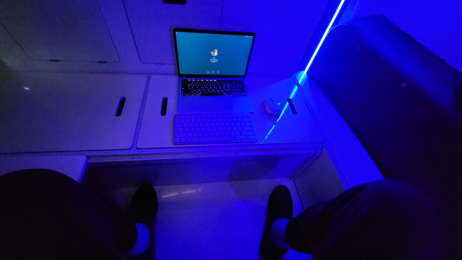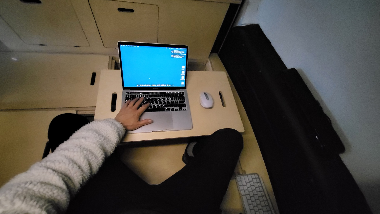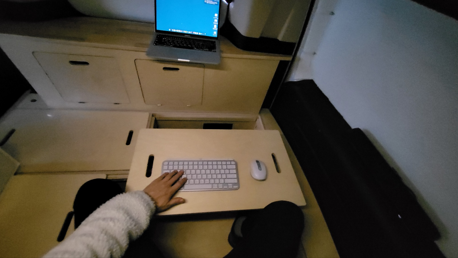 침상키트의 중간 부분 덮개를 치우면 다리를 넣을 수 있는 공간이 나오고 리프팅 테이블 오픈하여 노트북, 마우스 배치해 보았다. 사용성 훨씬 향상된다.