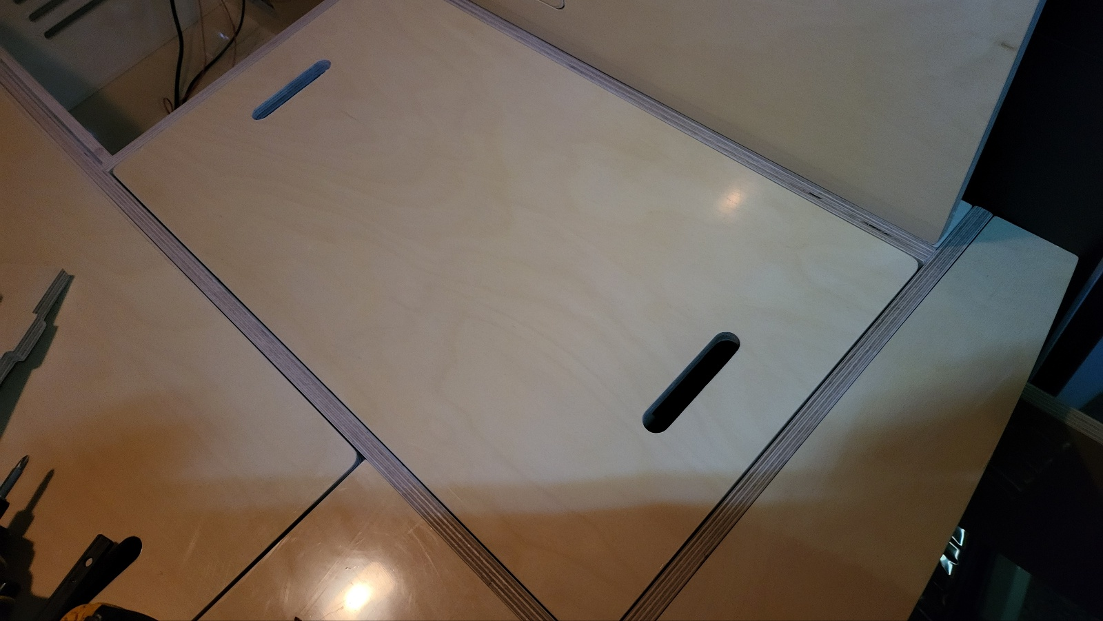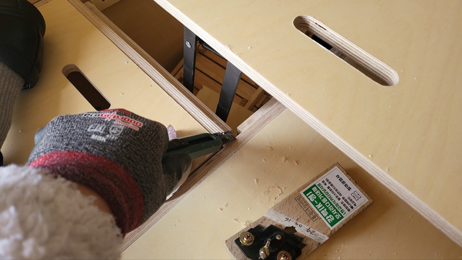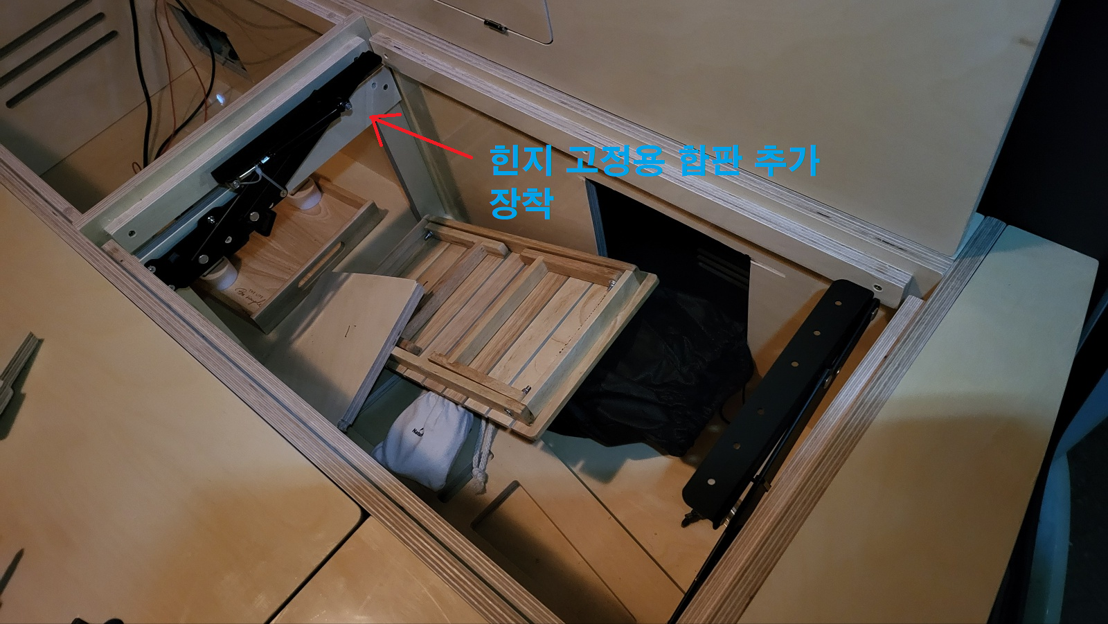 - 힌지 얼라인 , 나사못 박을때 틀어짐 등의 작업 오차 2mm 정도만 생겨도 반드시 간섭하는 곳이 생긴다. 최종 상판 열고 닫을 때 간섭생겨 뻑뻑한 곳 발생한다. 간섭 있는 곳 모서리 부분을 칼로 깎고 사포질 한다.