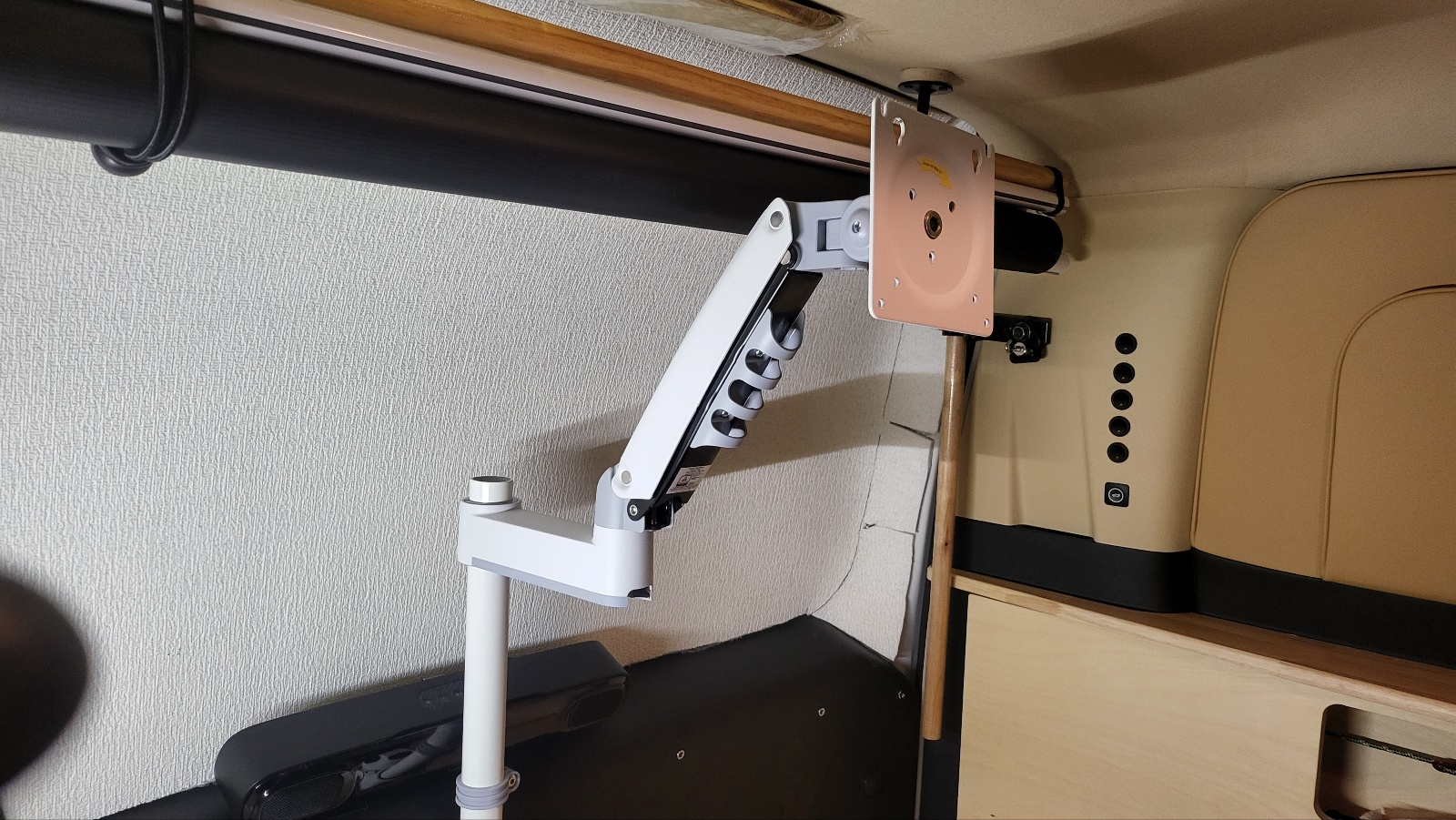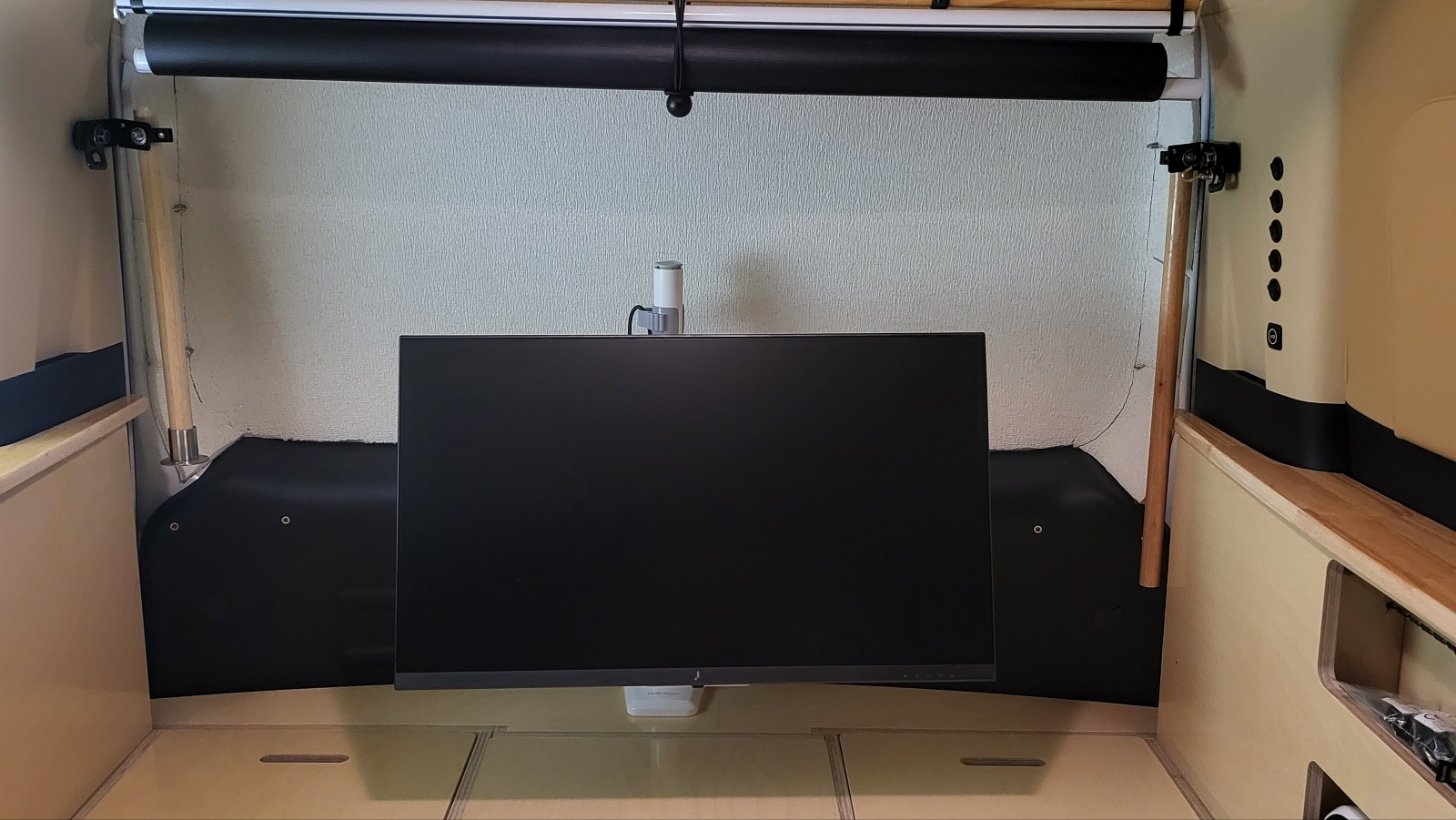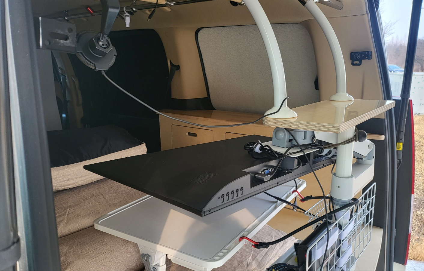 - 트렁크 끝단 중간 지점에 모니터 폴대 달고 모니터 암 2개 장착