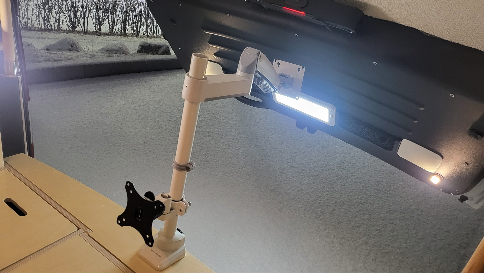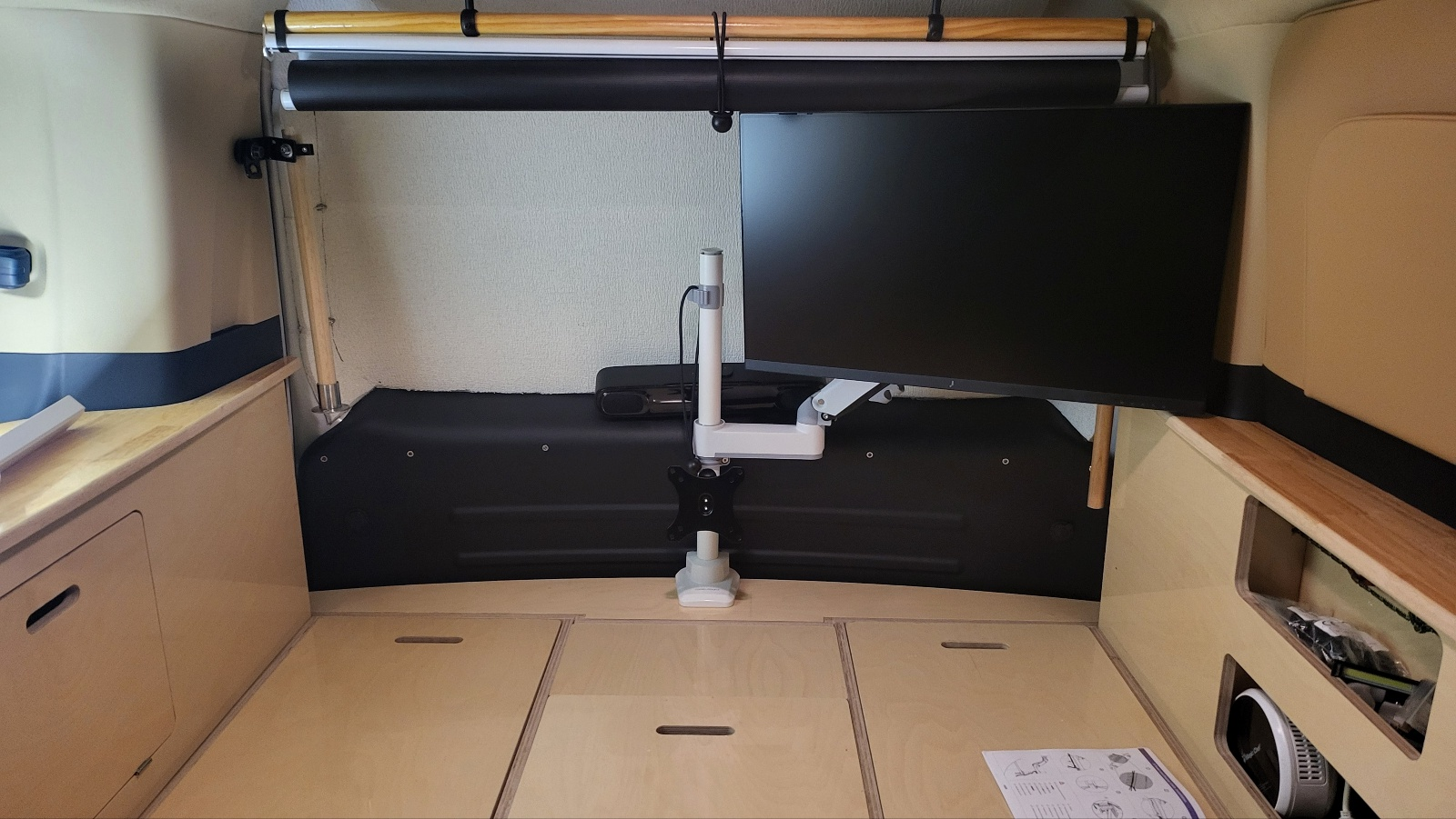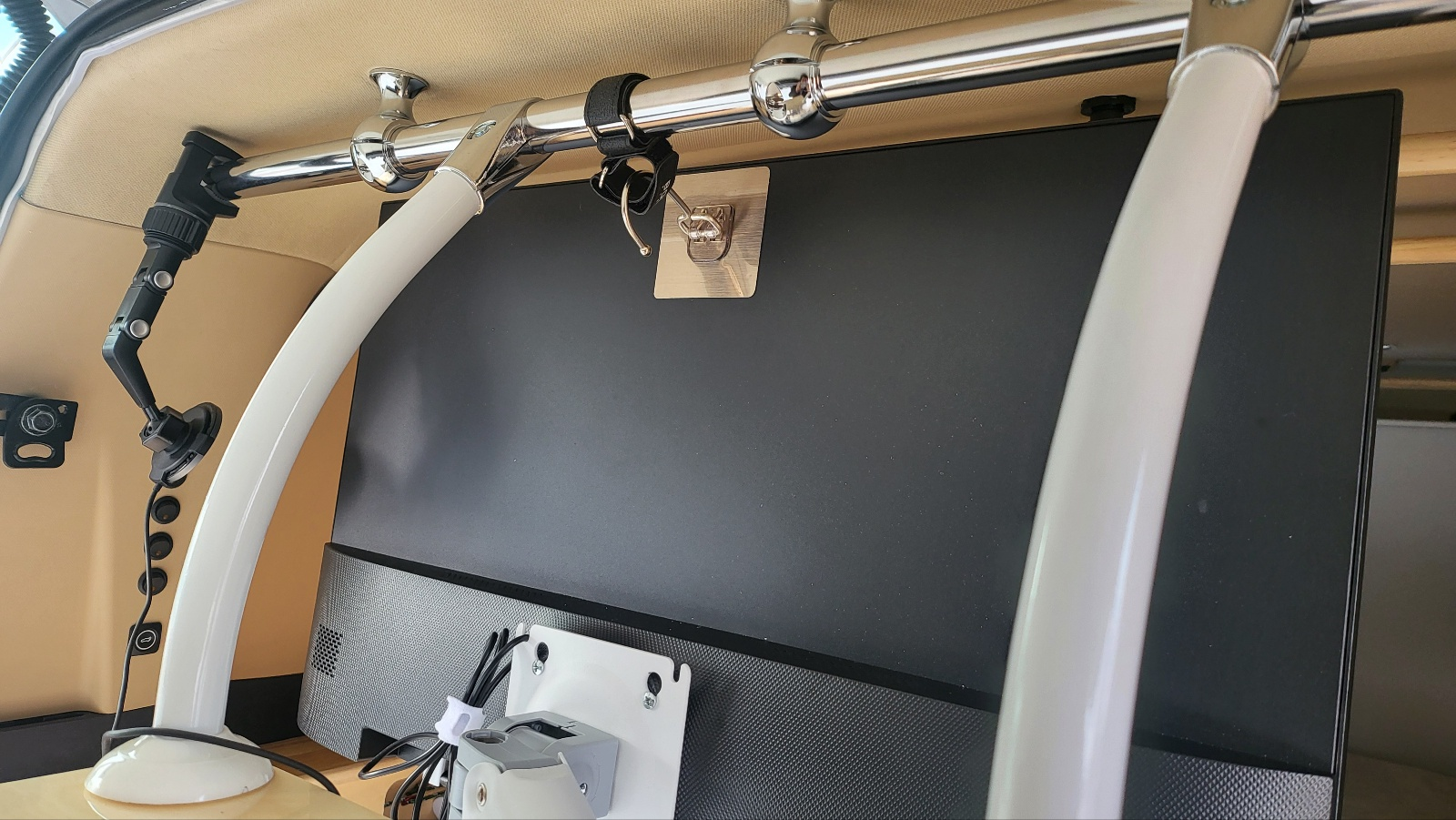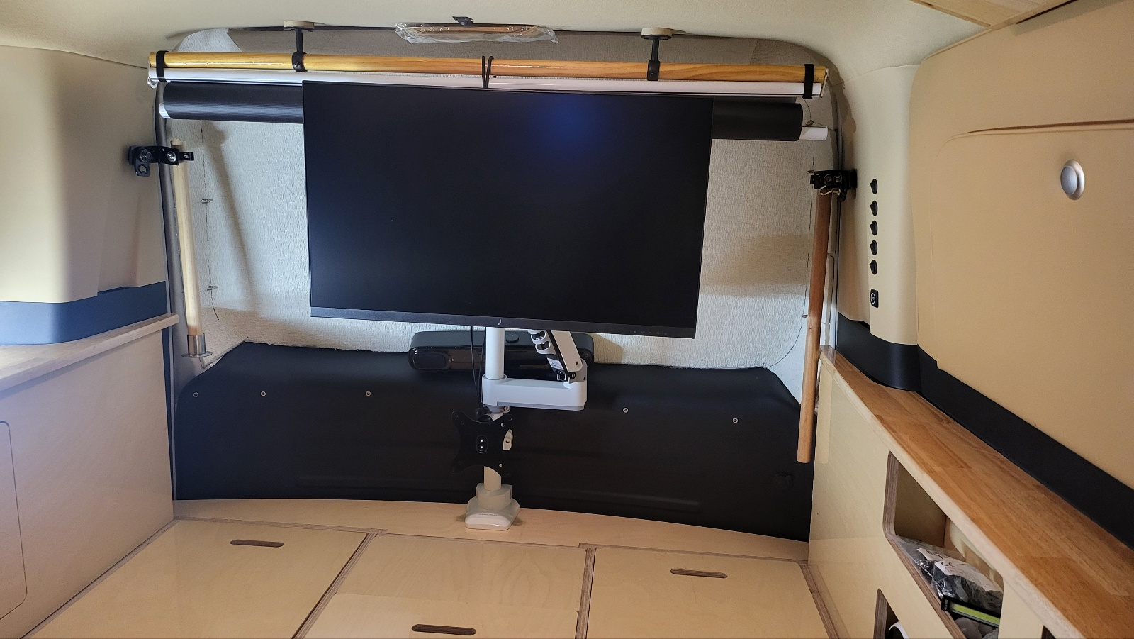 - 트렁크 끝단 중간 지점에 모니터 폴대 달고 모니터 암 2개 장착