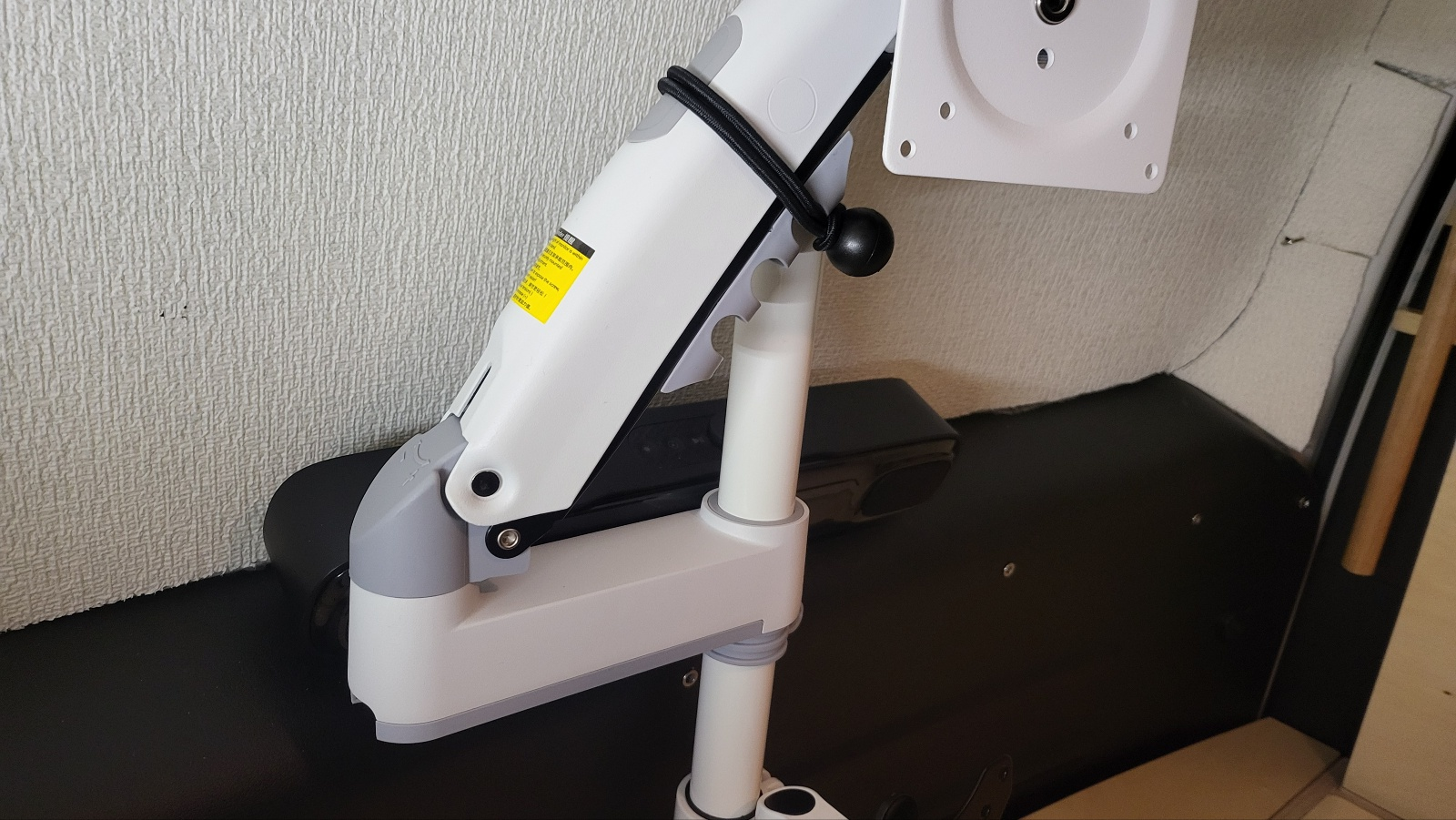 모니터 거치봉에 로프 걸어두고 카라비너로 테이블 상판을 잡아두게 해뒀다.