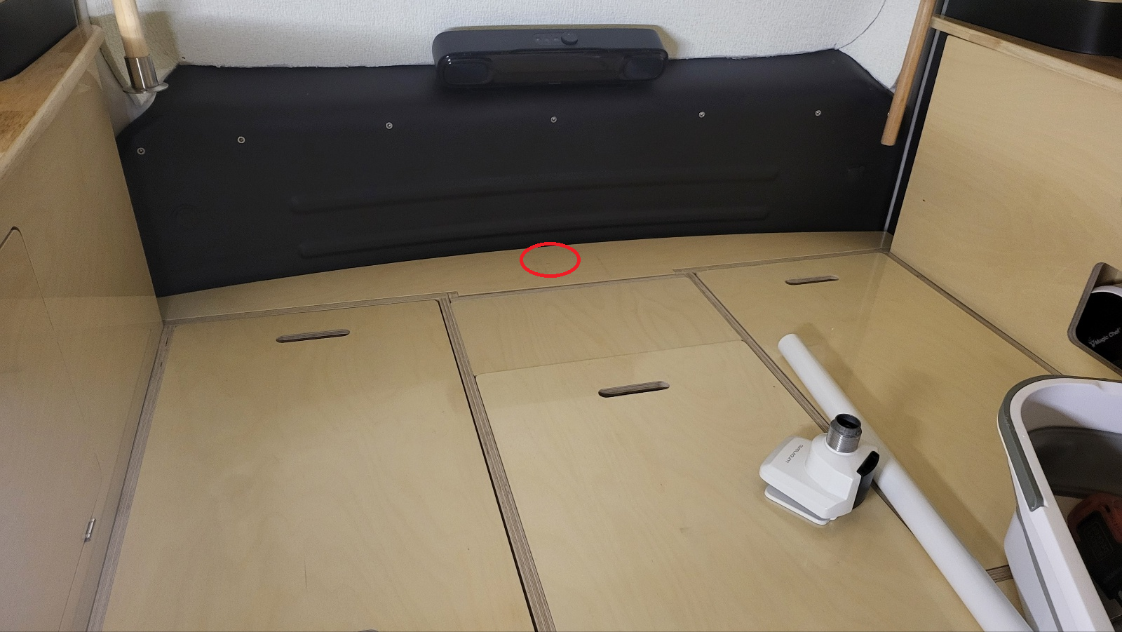 - 모니터 폴대 클램프 장착시 뒷문과 간섭 있기 때문에 침상 일부 잘라낸다.