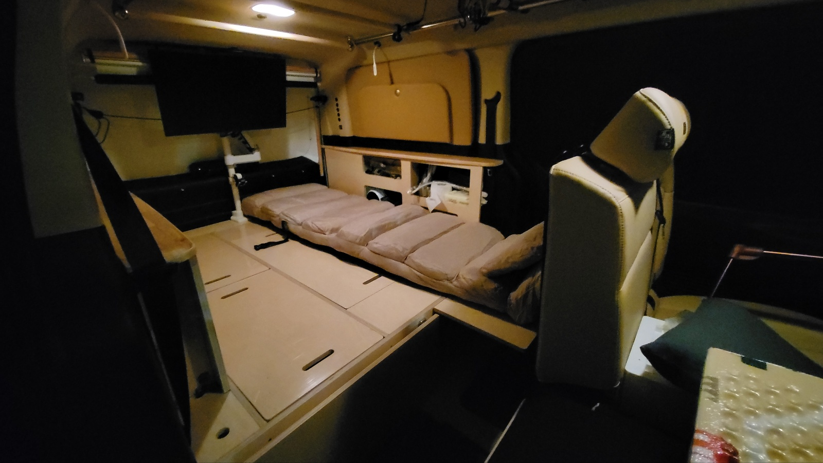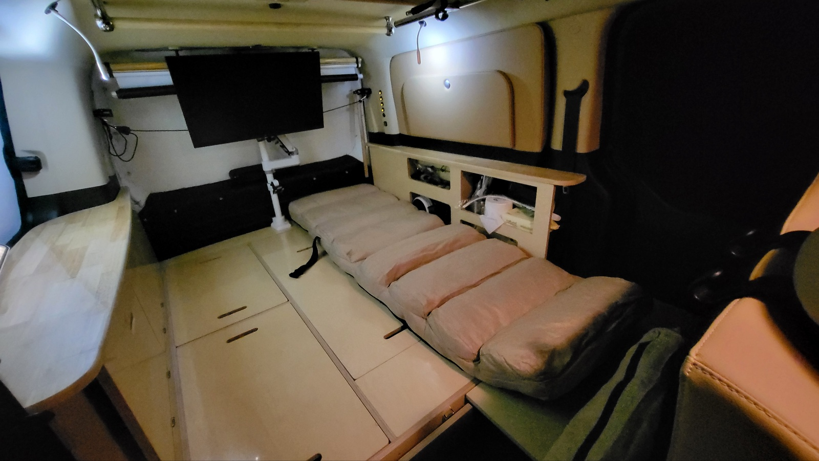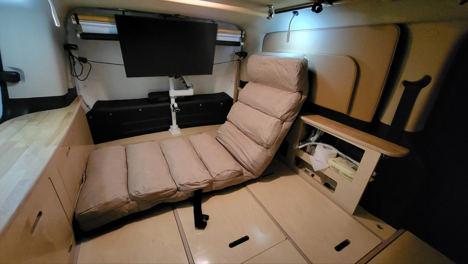 - 무릎, 허리, 목 3군데 관절 조절 가능한 리클라이닝 좌식 의자를 스타리아 침상키트에 배치해보니 유용하다.