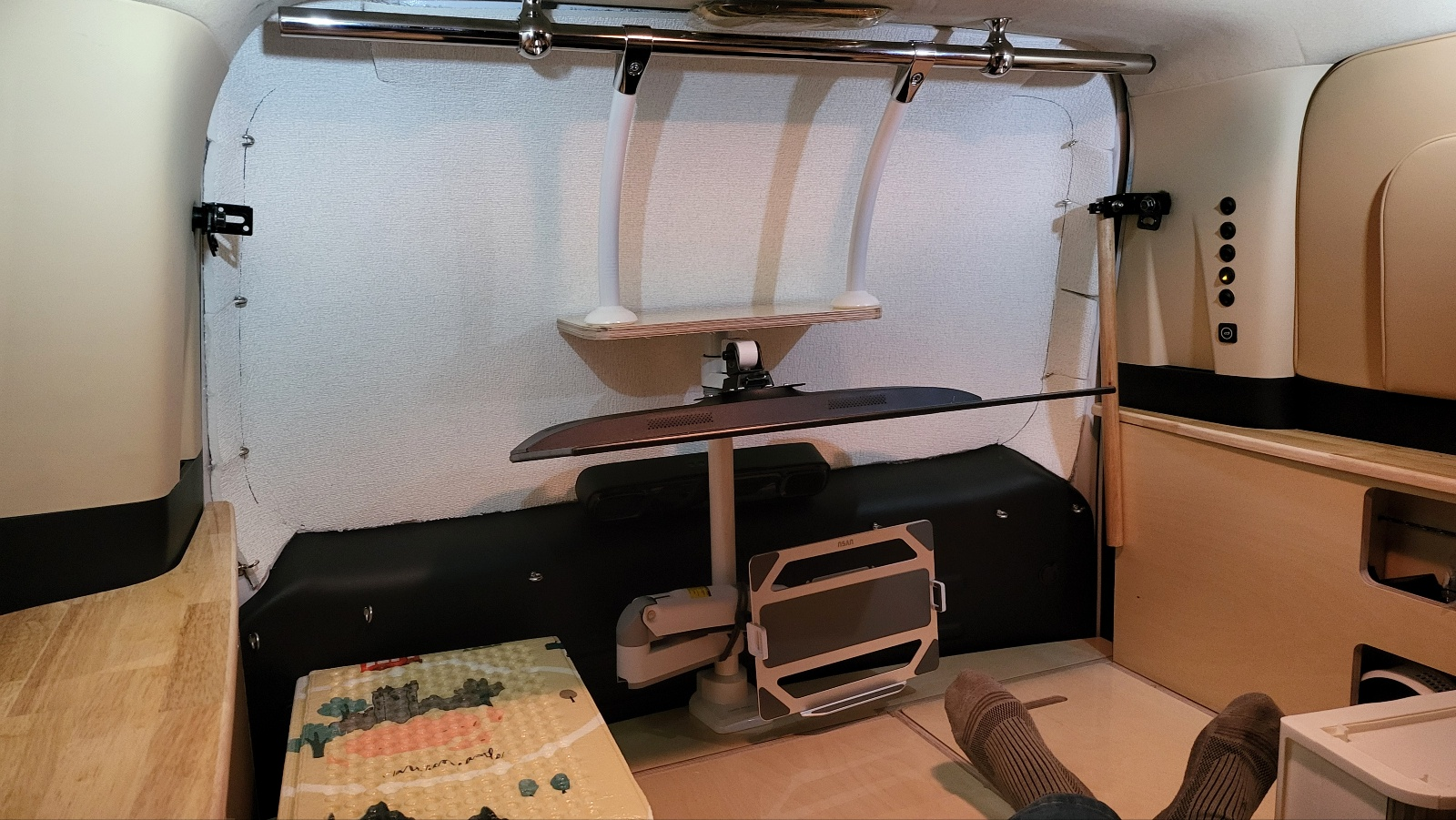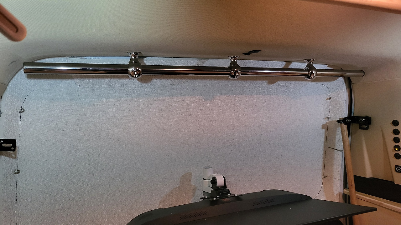 모니터 거치대 장착 - 트렁크 끝단 중간 지점에 모니터 폴대 달고 모니터 암 2개 장착 - 모니터 폴대 클램프 장착시 뒷문과 간섭 있기 때문에 침상 일부 잘라낸다. 작업 상세 아래 사