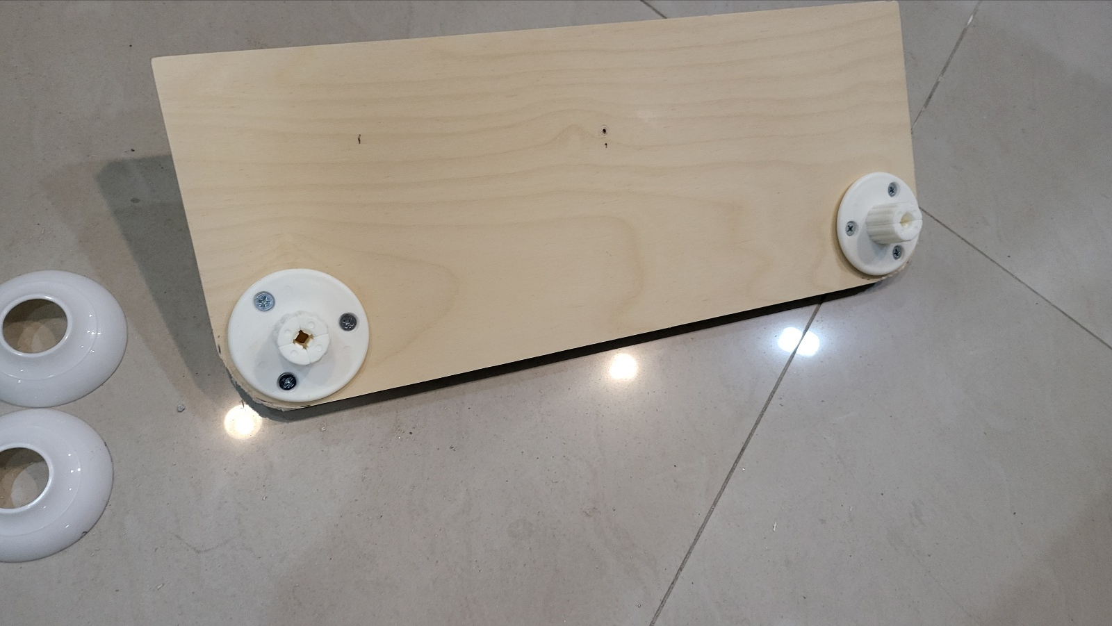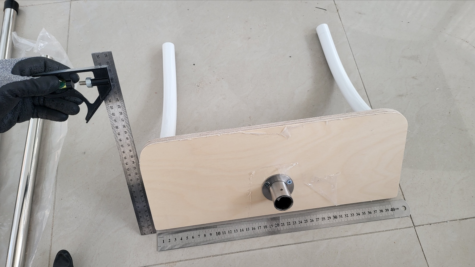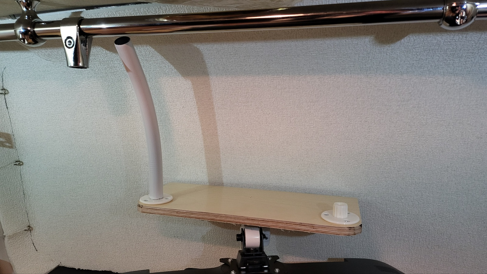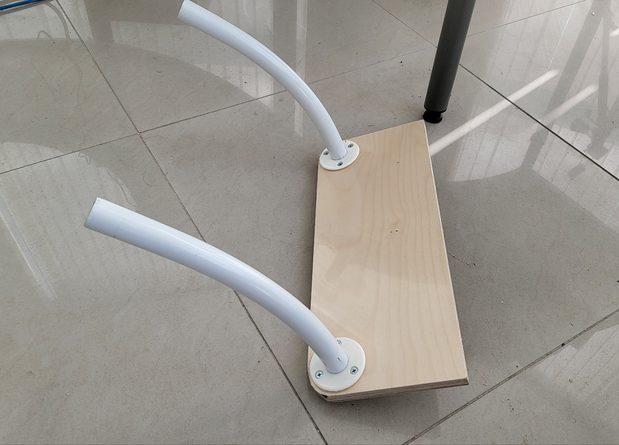 합판 바닥 부분에는 파이프 발을 나사못 고정. 이 제품의 원래용도는 지름 25mm 파이프 고정용인데 이 제품의 외경이 거치대 봉 내경 치수와 거의 동일하여 거치대 봉에 끼워서 고정가능.