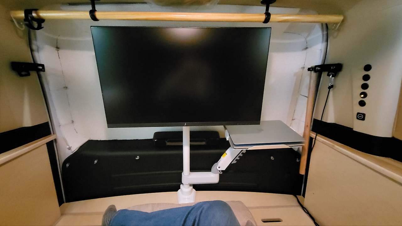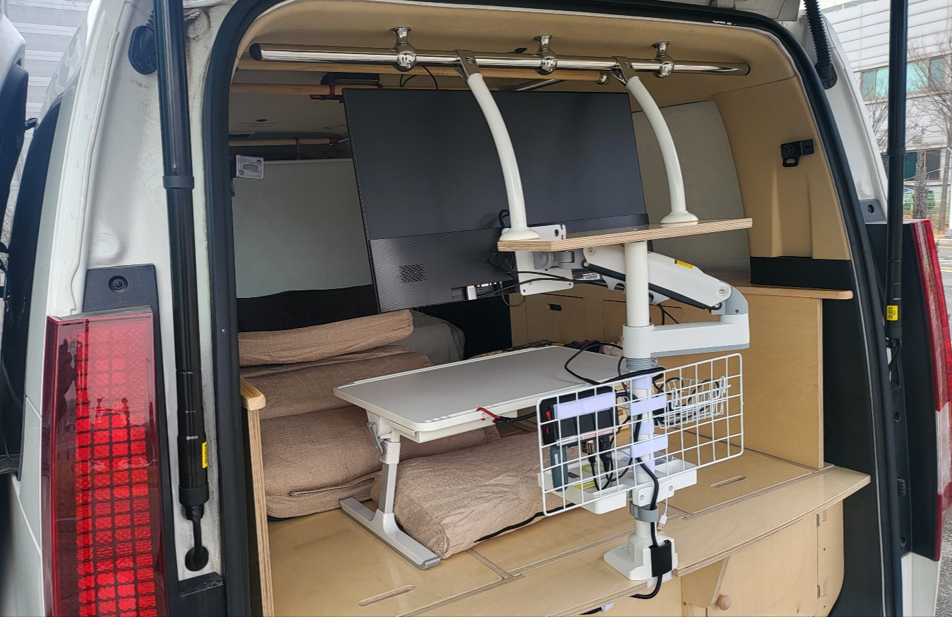 개요 - 스타리아 트렁크 테일게이트 밀착 배치된 컴퓨팅 환경. - 노트북에 모니터 확장 연결하여 듀얼 모니터 활용. - 테일게이트에 배치한 블루투스 스피커로 노트북 사운드 출력. - LTE 라우